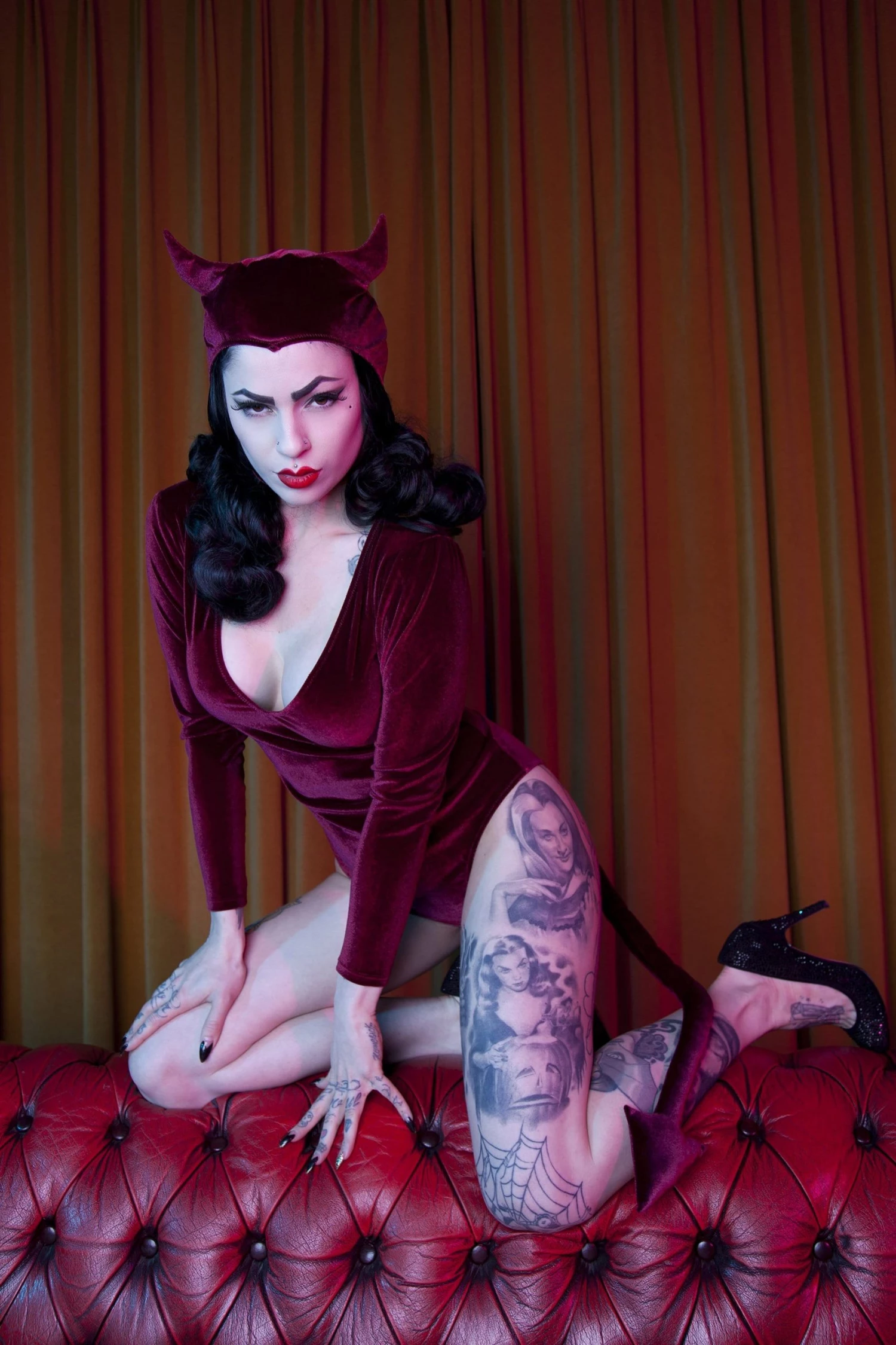Live out your wildest Devil-woman fantasies in our fun and playful Devil set! The body features lush wine velvet, long sleeves and a deep v-neck cut at the front. It is adorned with the all-important forked tail detail at the back, and comes complete with a separate hat that fits snugly around the head, features perky stuffed devil horns, and fastens with two satin buttons at the front of the neck. The tail is detachable (with poppers) and the body fastens with poppers at the gusset. Did we just hear someone say hellfire?