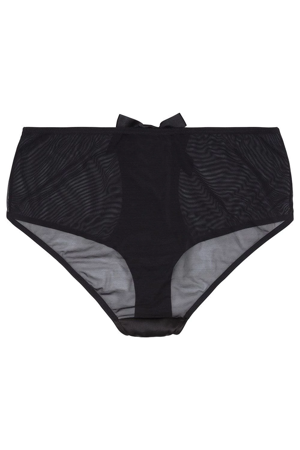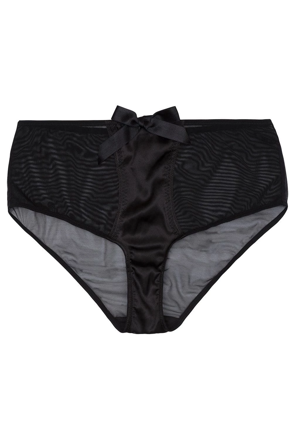 Sitting just below the smallest part of the waist, these classic knickers feature a satin centre panel, complete with retro contrast stitching and a large bow to match. The rest of the brief is wickedly sheer! Pair with the Bullet Bra or the Overwire for a complete 50s Pin Up look.
