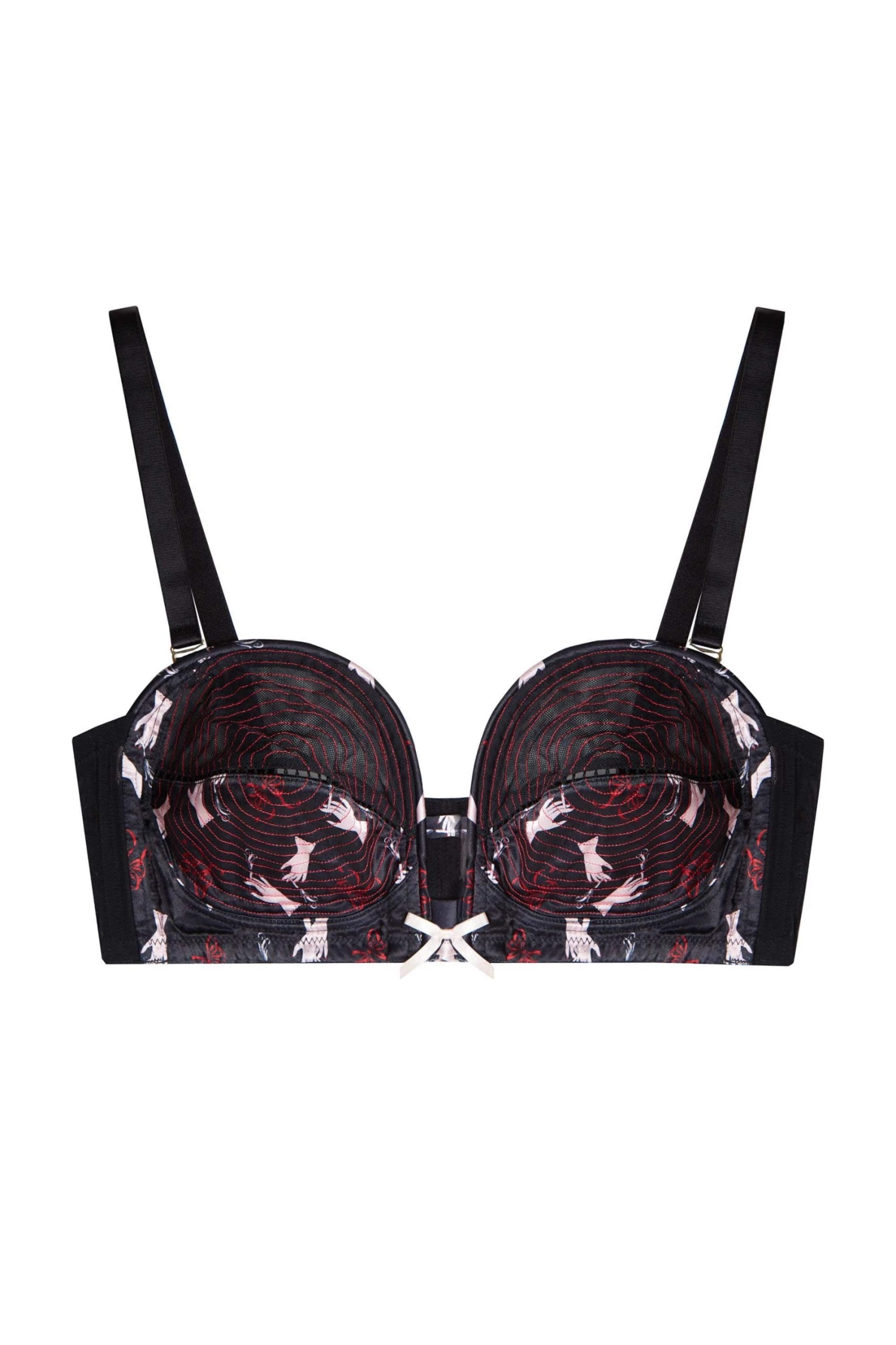 Smokin’ hot! The Blaze set features a sexy cigarette-weilding hand print designed exclusively to us in-house, with red bows dotted around. On our classic overwire bra red contrast spiral stitching embellishes the cups and it’s finished with a peachy centre bow.