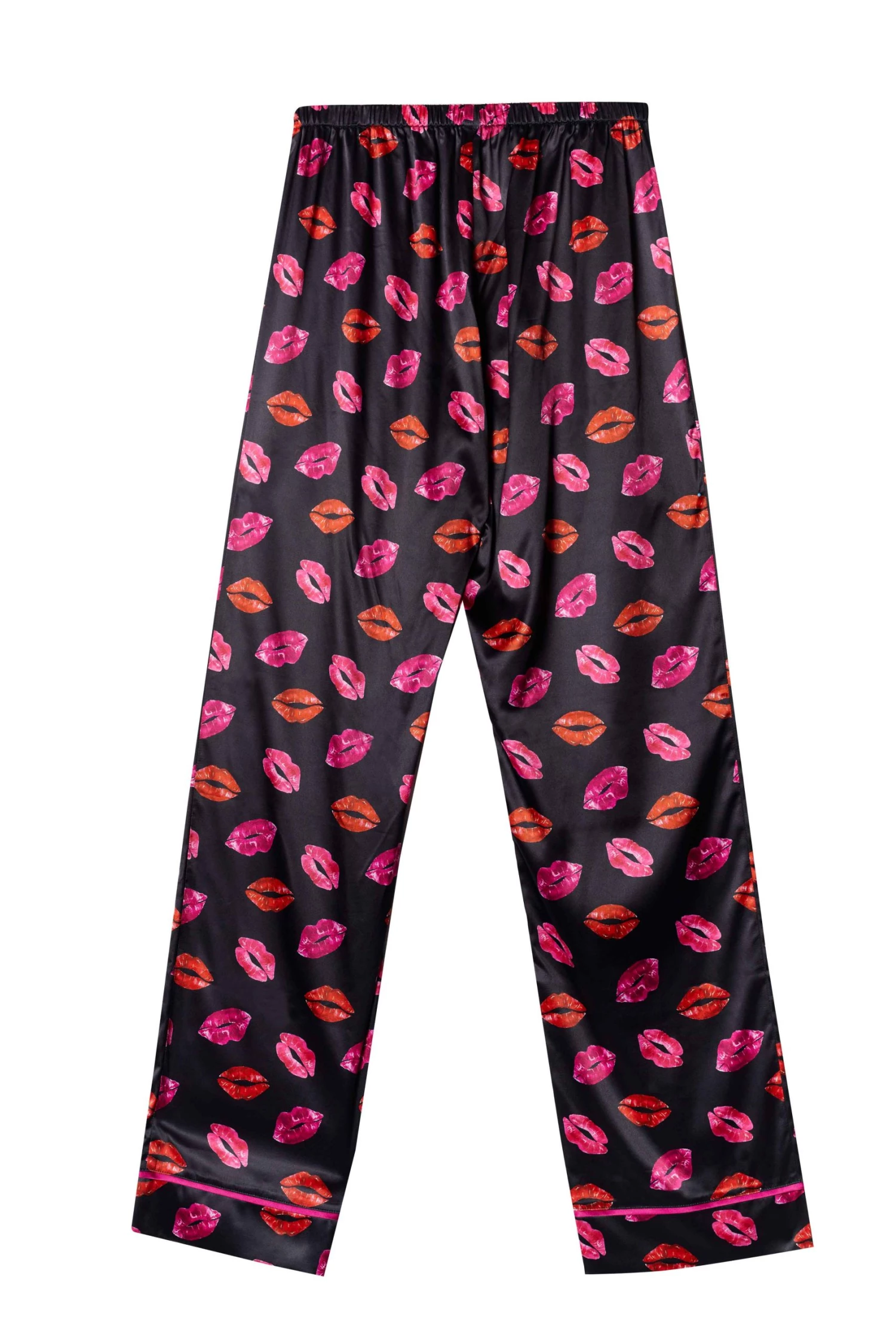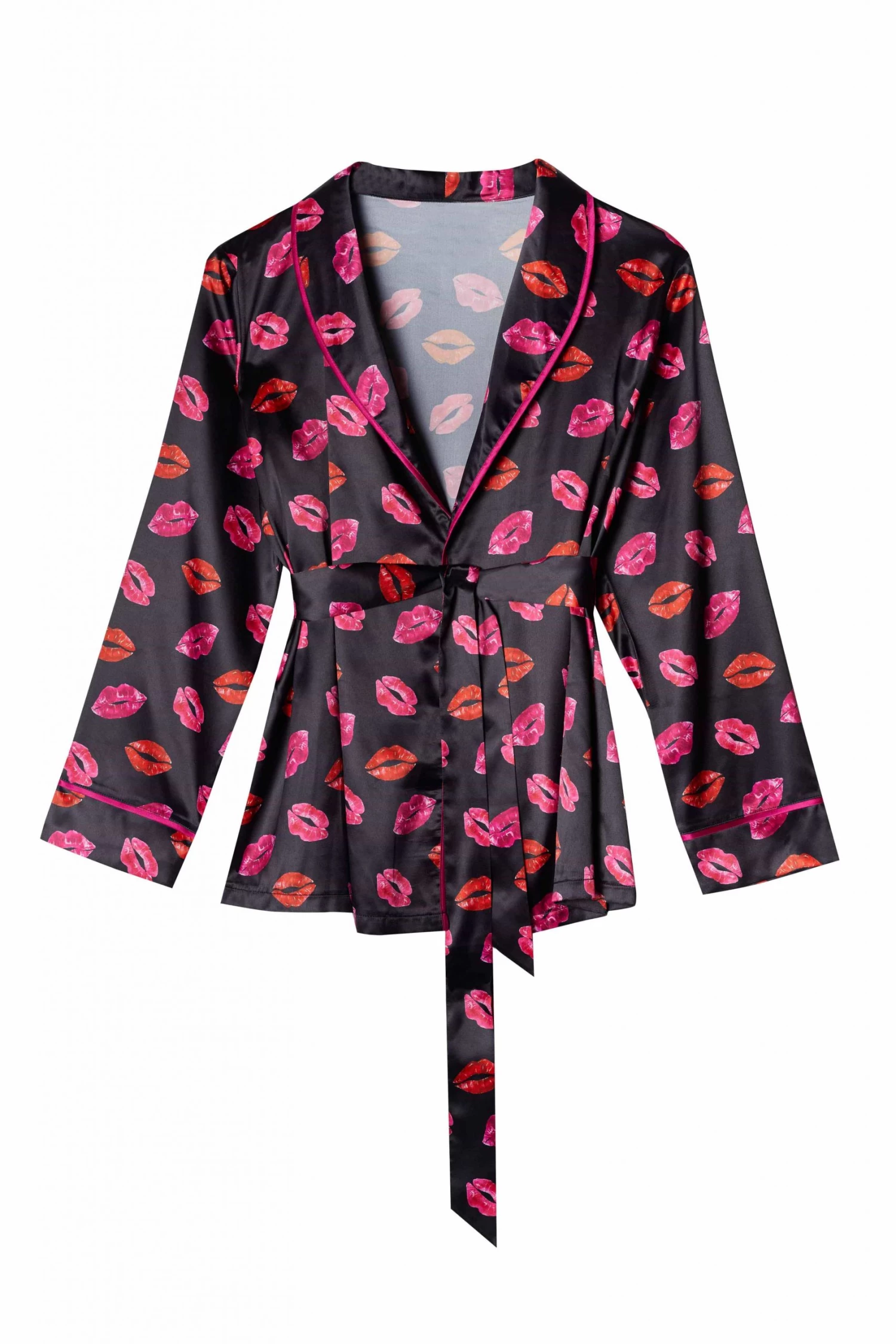Kisses all over! The kiss printed PJ set features ravishing red and pink kisses over black, with contrasting piping. The top wraps around the body with a satin tie, and the trousers are loosely fitting.