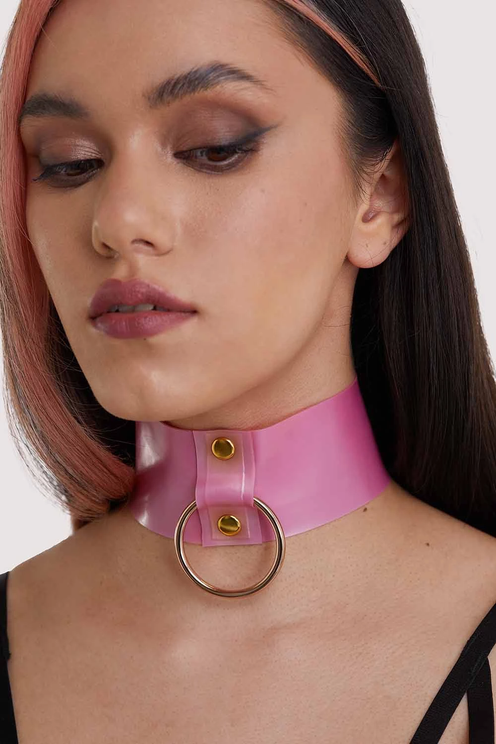 Oh My! The pink latex choker features a big gold o ring detail at the front, with two rows of poppers at the back to adjust. The baby pink latex has a slight sparkle to it too! Pair with the latex peplum skirt for the full look.
