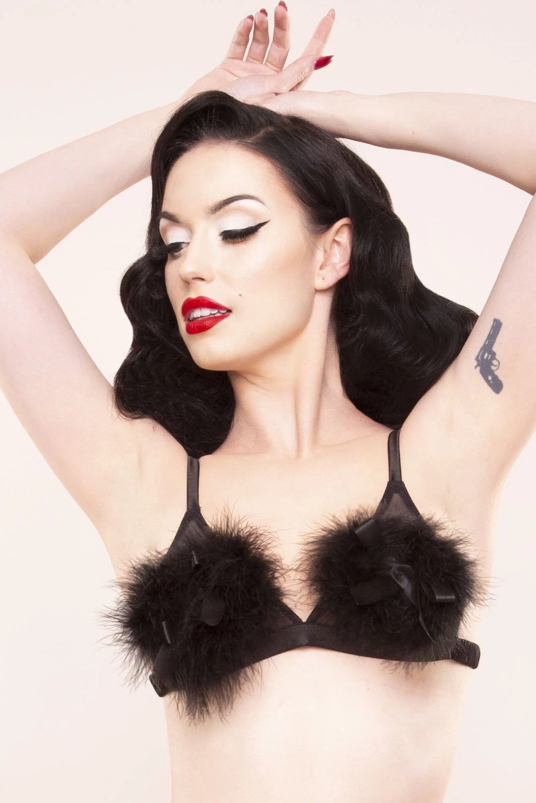 Simply apply the powder puff triangle bra in black to your body for an instant pick me up. This oozes, retro glamour and luxe to those that dare to stare. A simple elasticated satin band and two straps hold two triangle cups adorned with feather powder puffs and satin bows. Add some o lala to your lingerie collection.