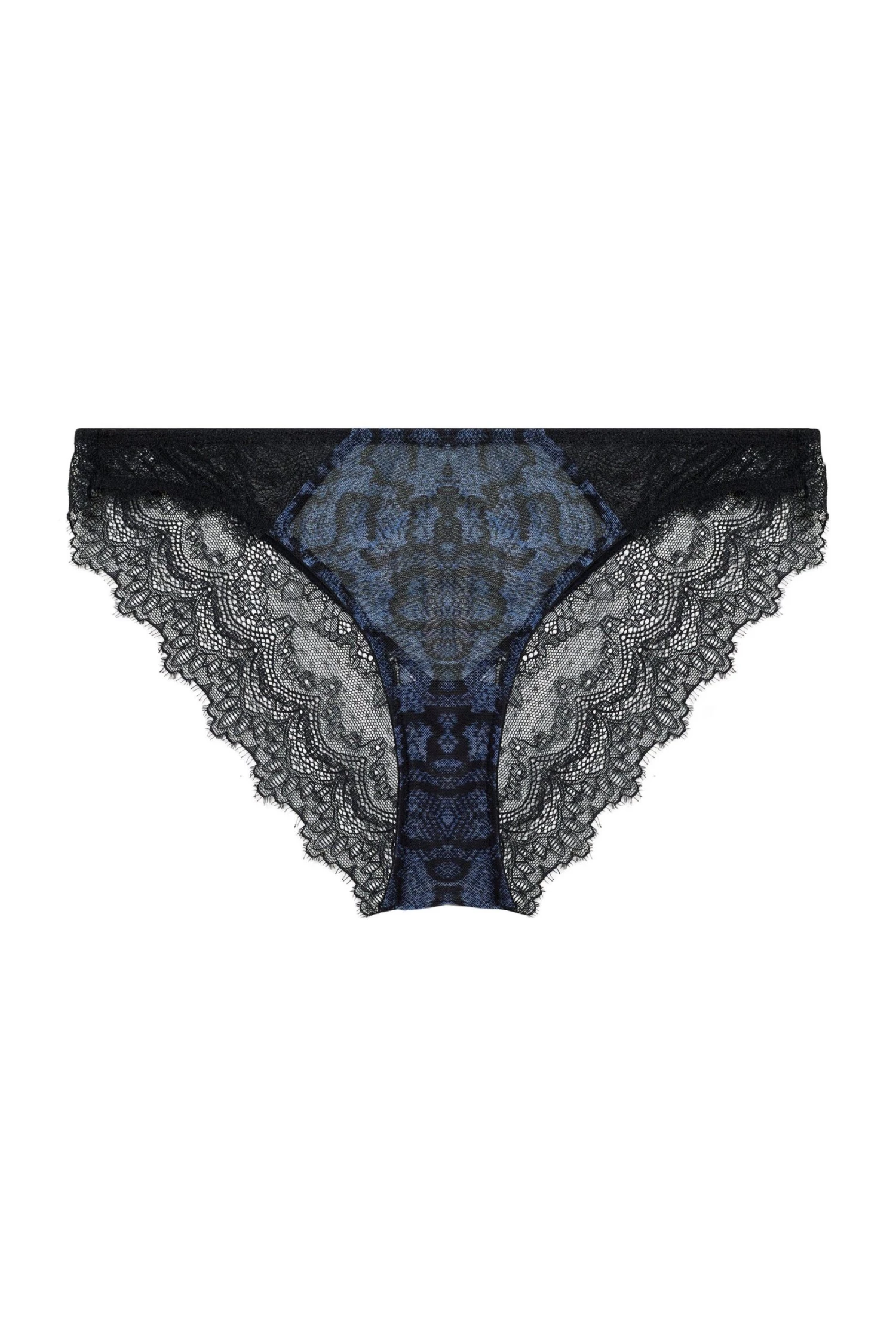 - Sheer mesh snake print brazilian briefs with black lace detailing
