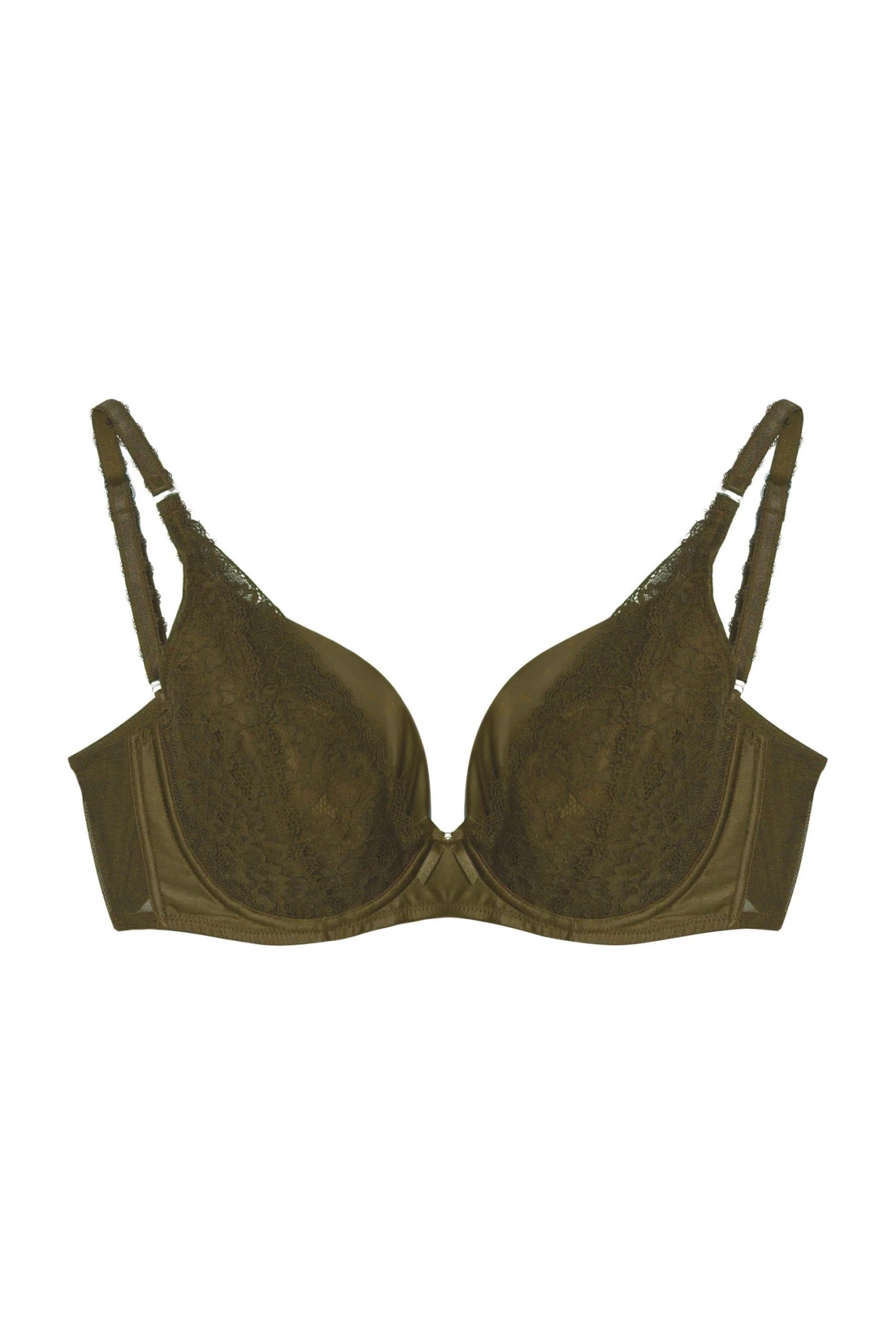 Feel sensational in our Sophia Olive Plunge Push up Bra. This push up bra features padded cups which are underwired for ultimate support, and finished with a pretty lace overlay and a bow at the centre. Match with our Sophia Brief or Thong for the complete classy co-ord.