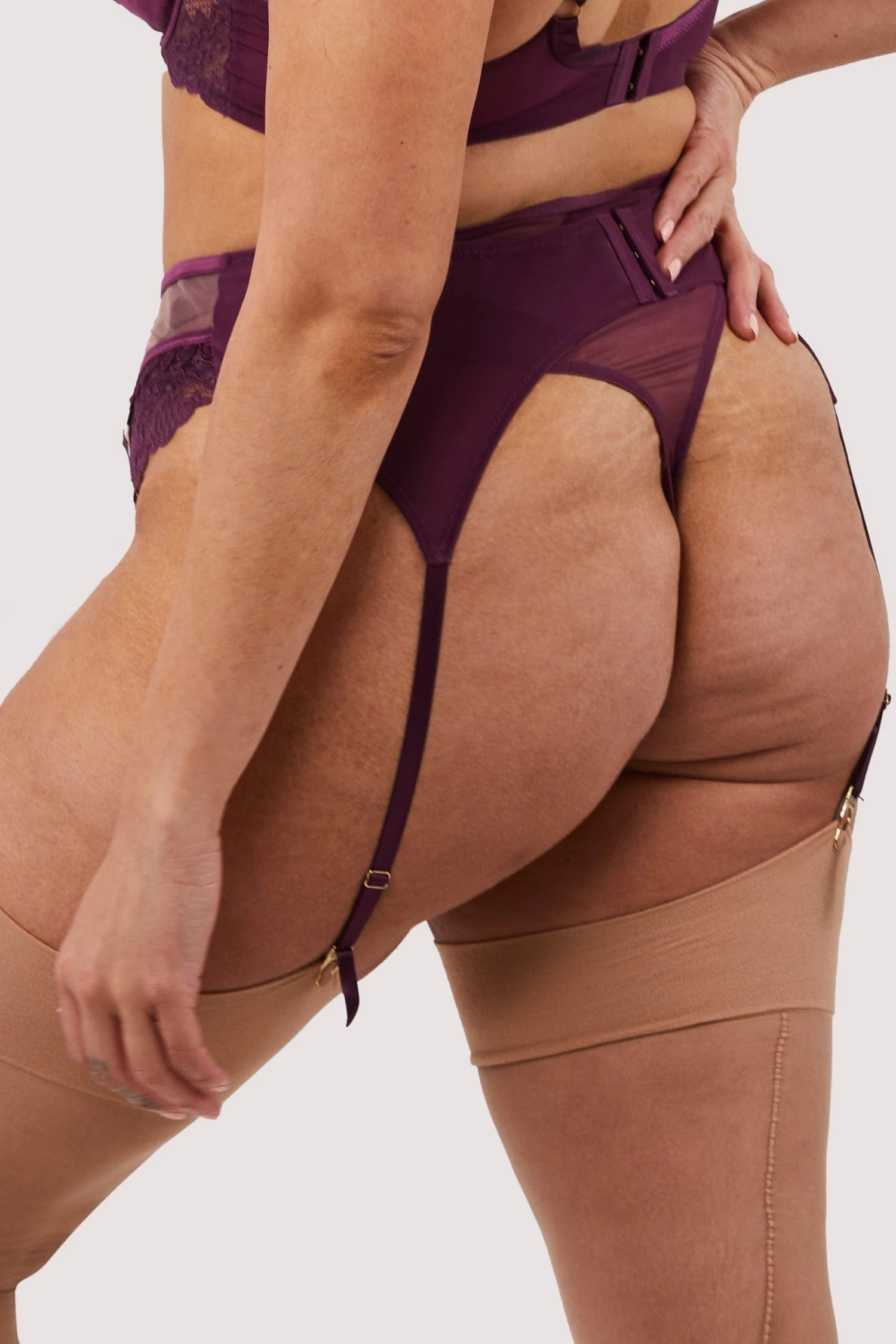 Introducing another exciting collaboration with UK model and body positive activist, Felicity Hayward! A work of art. Have you ever seen a more intricately detailed set than the Astrid? This sultry merlot coloured suspender features a sheer stretch mesh and lace, satin piping, and gorgeous lace trimings. It also has a cut out elastic waist to set itself aside from anything else you’ve seen before. A perfect final touch to complete the set.
