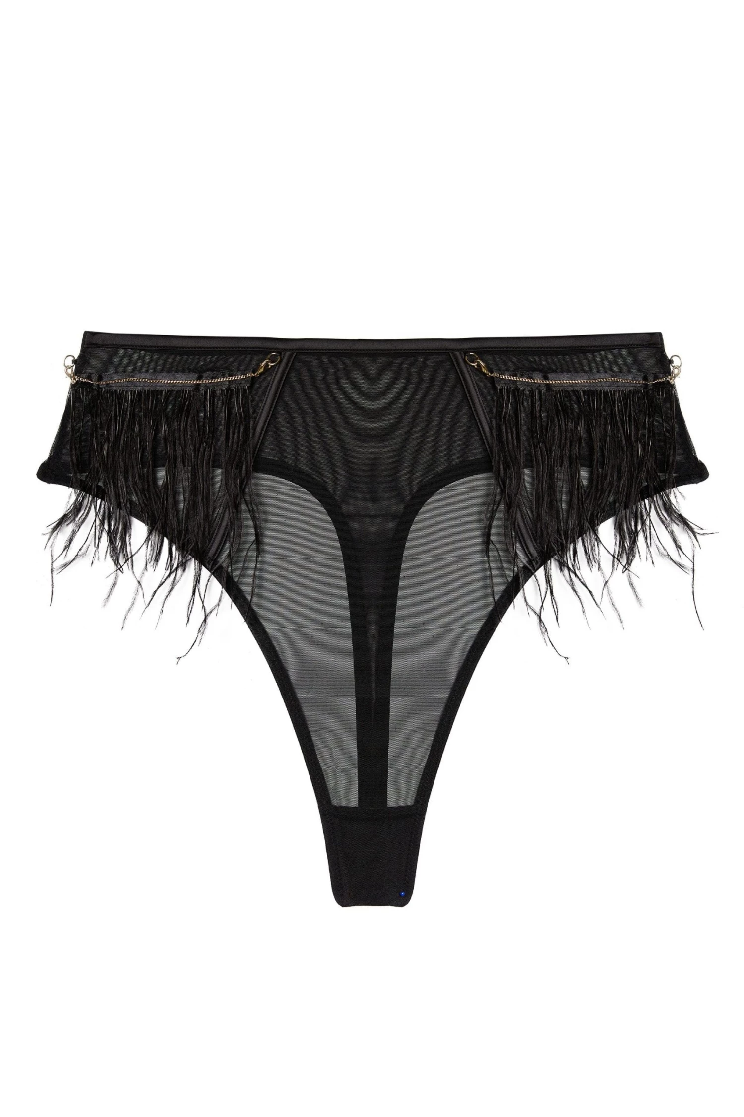Feel lavish in our Electra Black Brief, these high waisted briefs are constructed from sheer black mesh and features detachable fluffy feather accents on the hips for added wow factor. For the complete look, pair with the matching Electra Bra.
