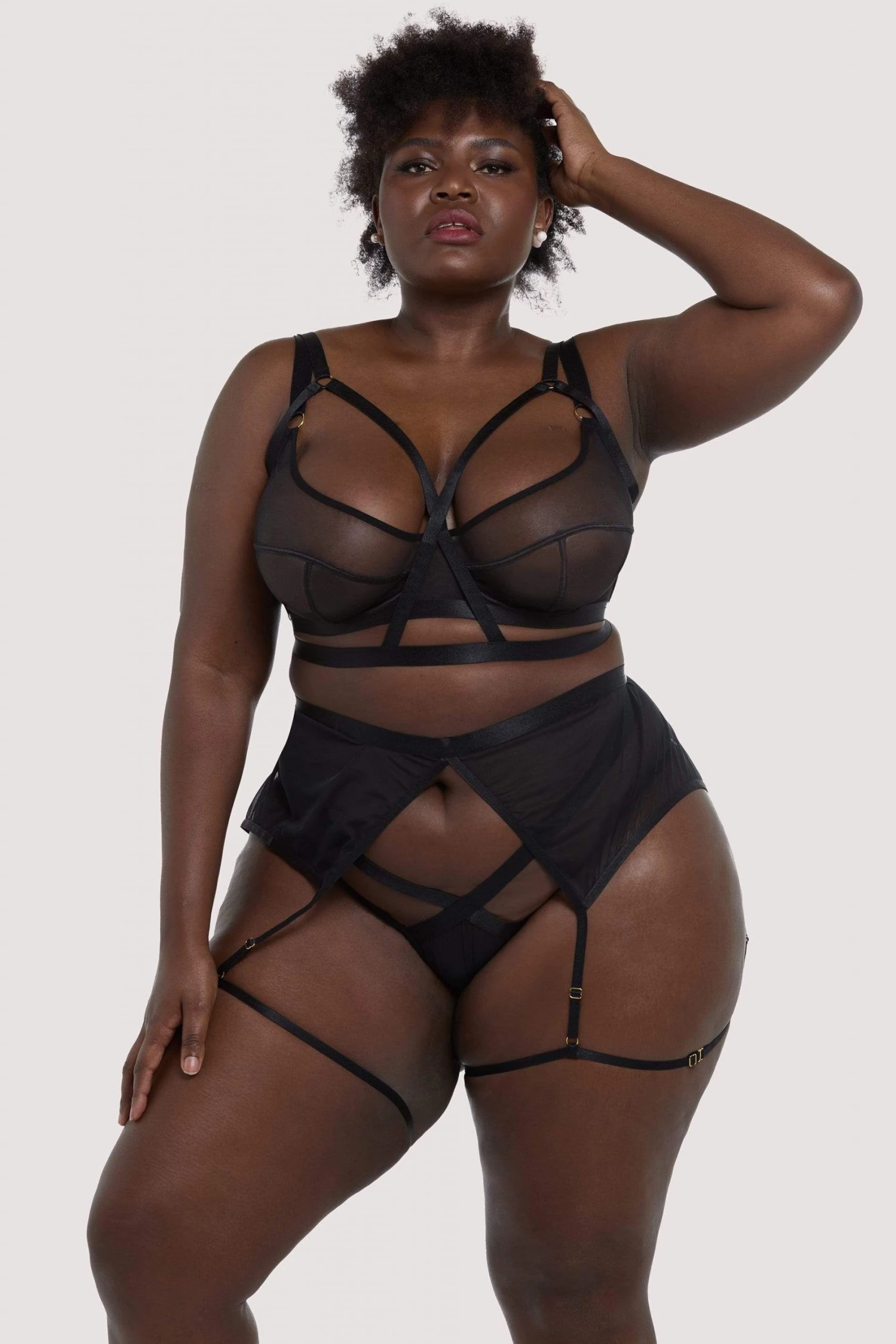 A step towards the dark side, this harness-laden set is bound to get hearts racing! Sheer black net is contrasted with black satin elastic straps that hug the thighs. The straps are adjustable to your liking, and work perfectly with short skirts and stay-ups!