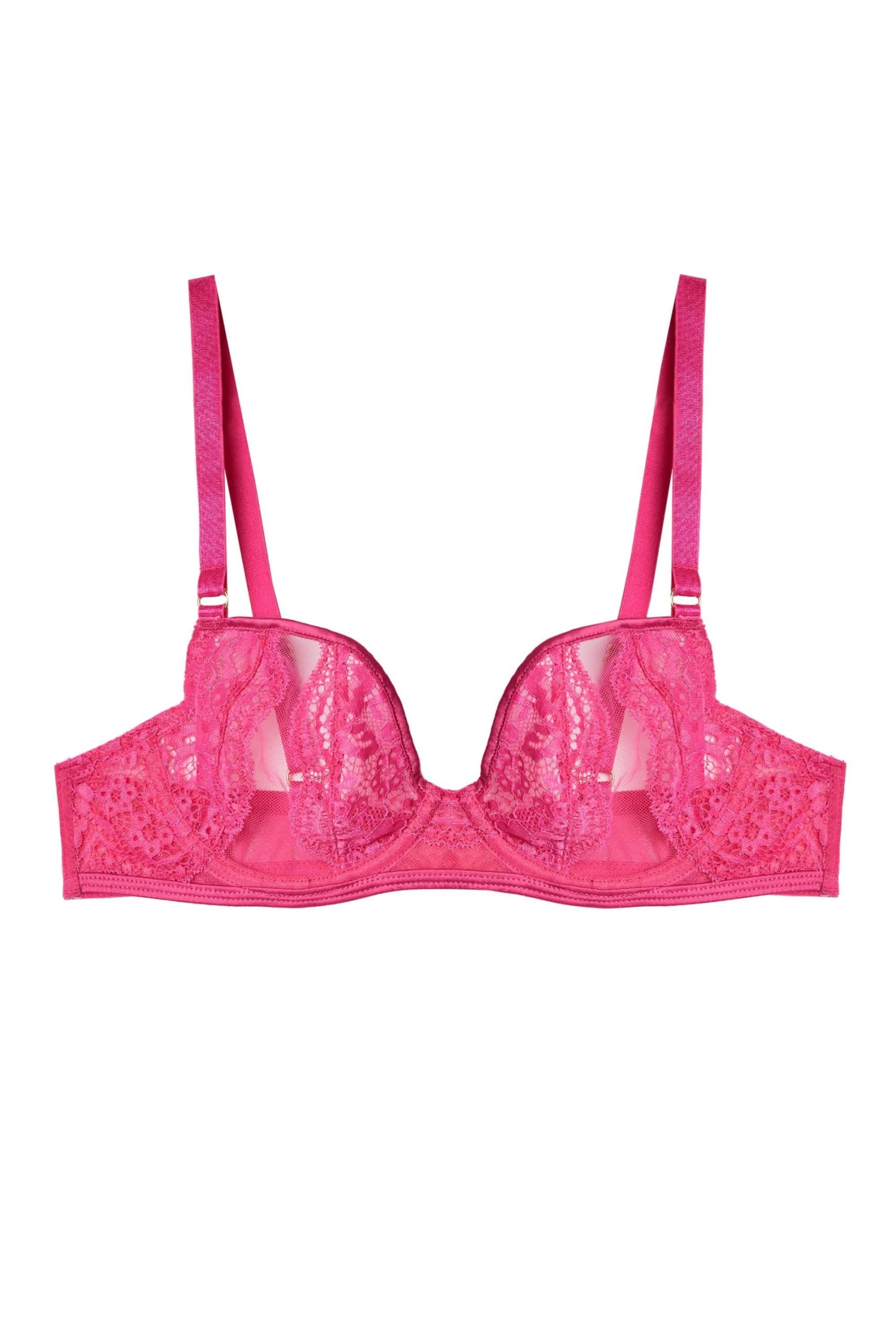 The bold, bright, and sexy Ophelia.. this lacy pink set is a must-have addition to your lingerie-drawer! The bra features lace and mesh cups and banding with sultry satin lining. Match with the high waist brief and lace suspender for a pink perfect set.