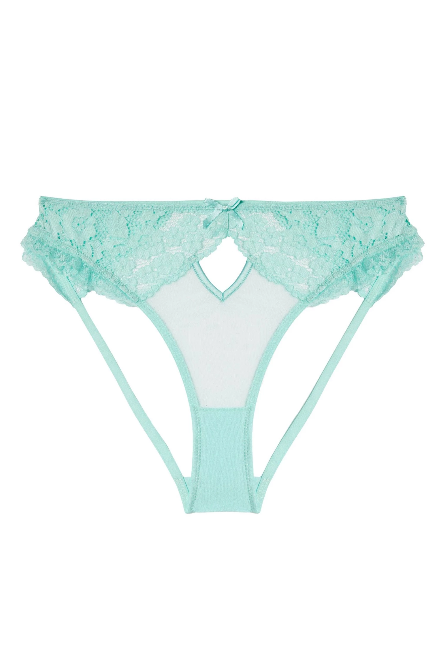 A frilly lace dream. This mermaid aqua coloured brief features a stunning lace trim with a sexy keyhole cutout, and finished with a fully open back for a sweet surprise. Match with the bra for a stunning set.