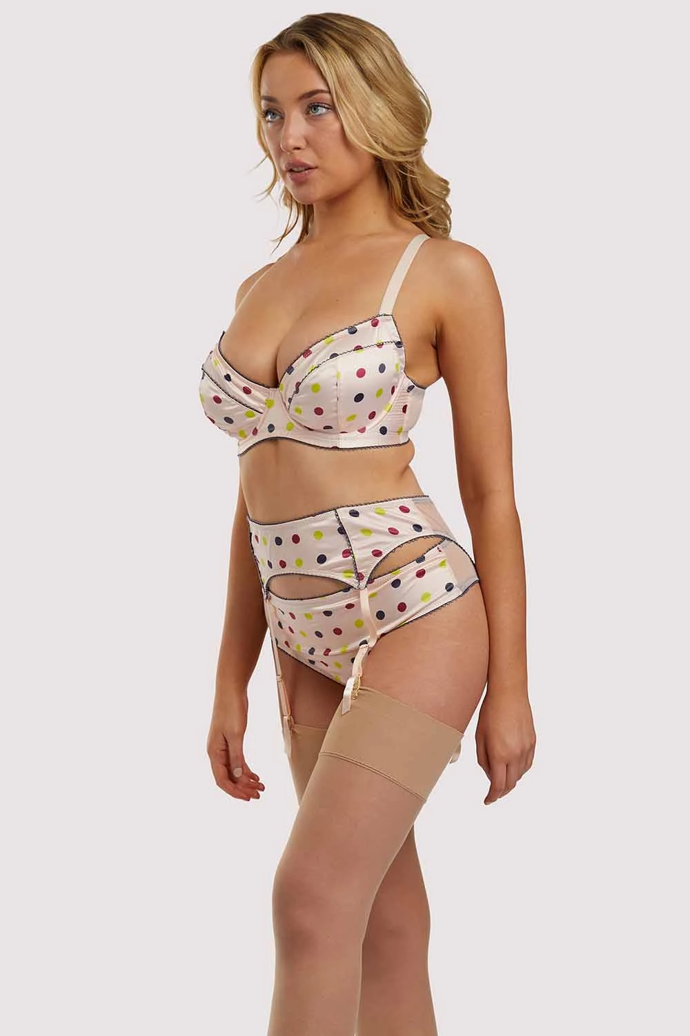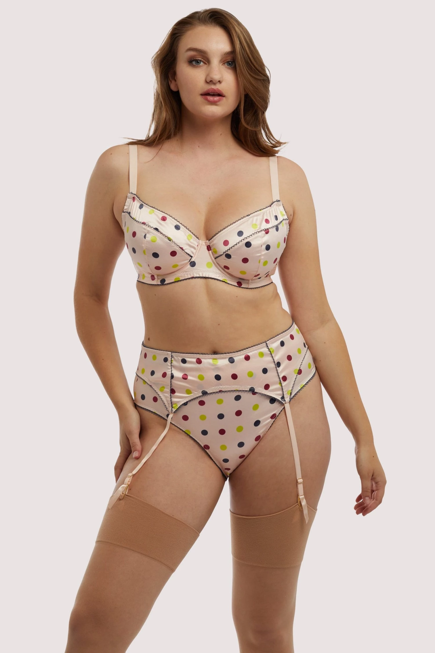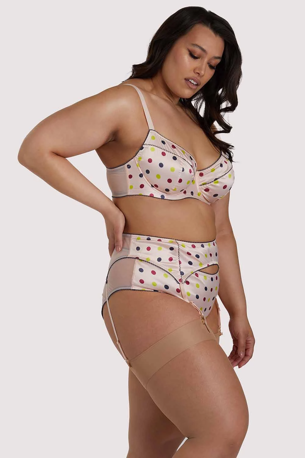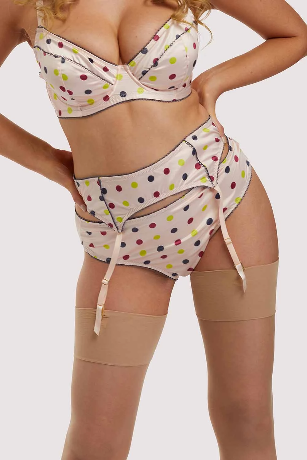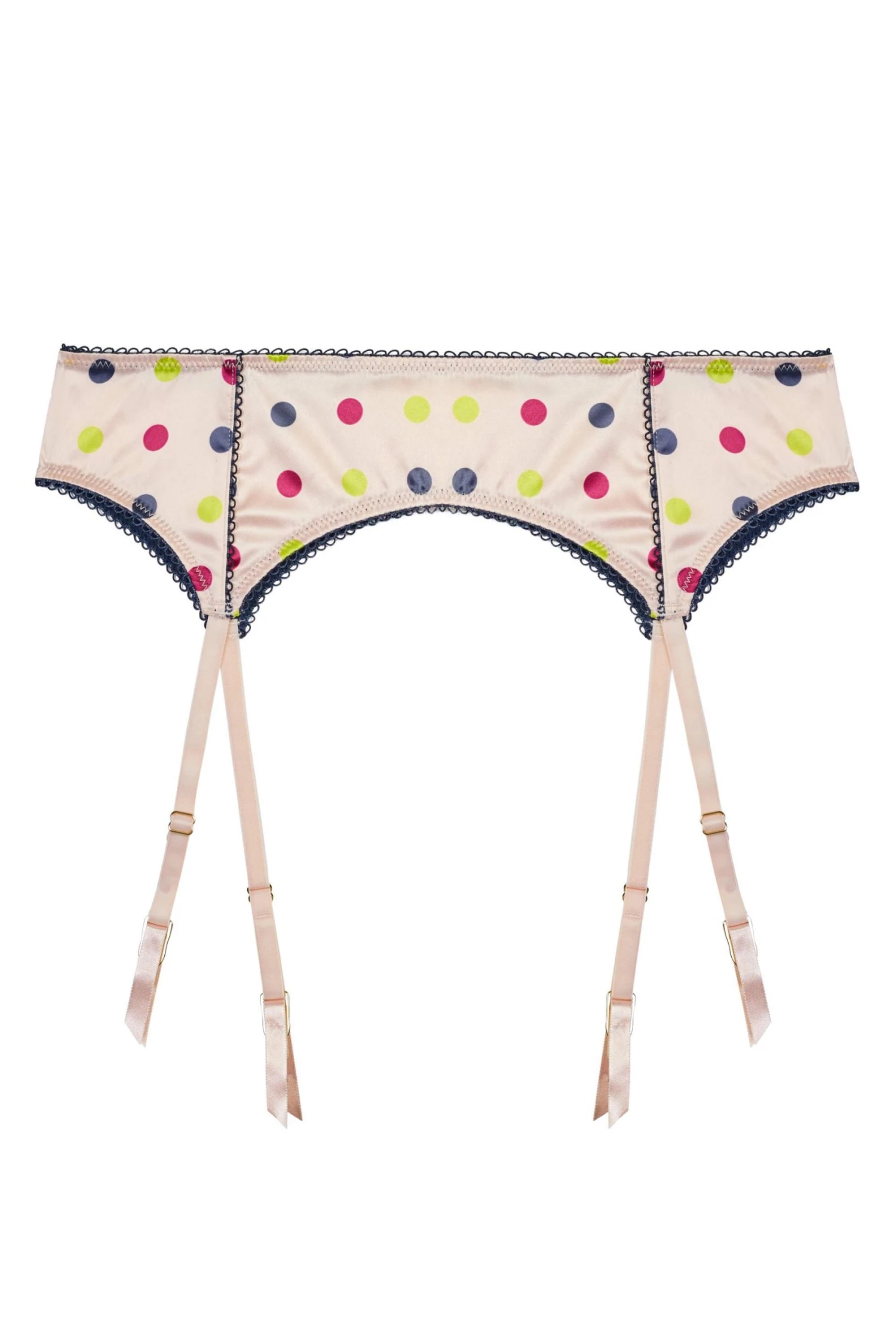 A spot of fun in this colourful pink suspender. The Rowswell features a multicoloured polka dot print with a delicately finished navy scalloped edge. Style with the matching bra and briefs to complete your look