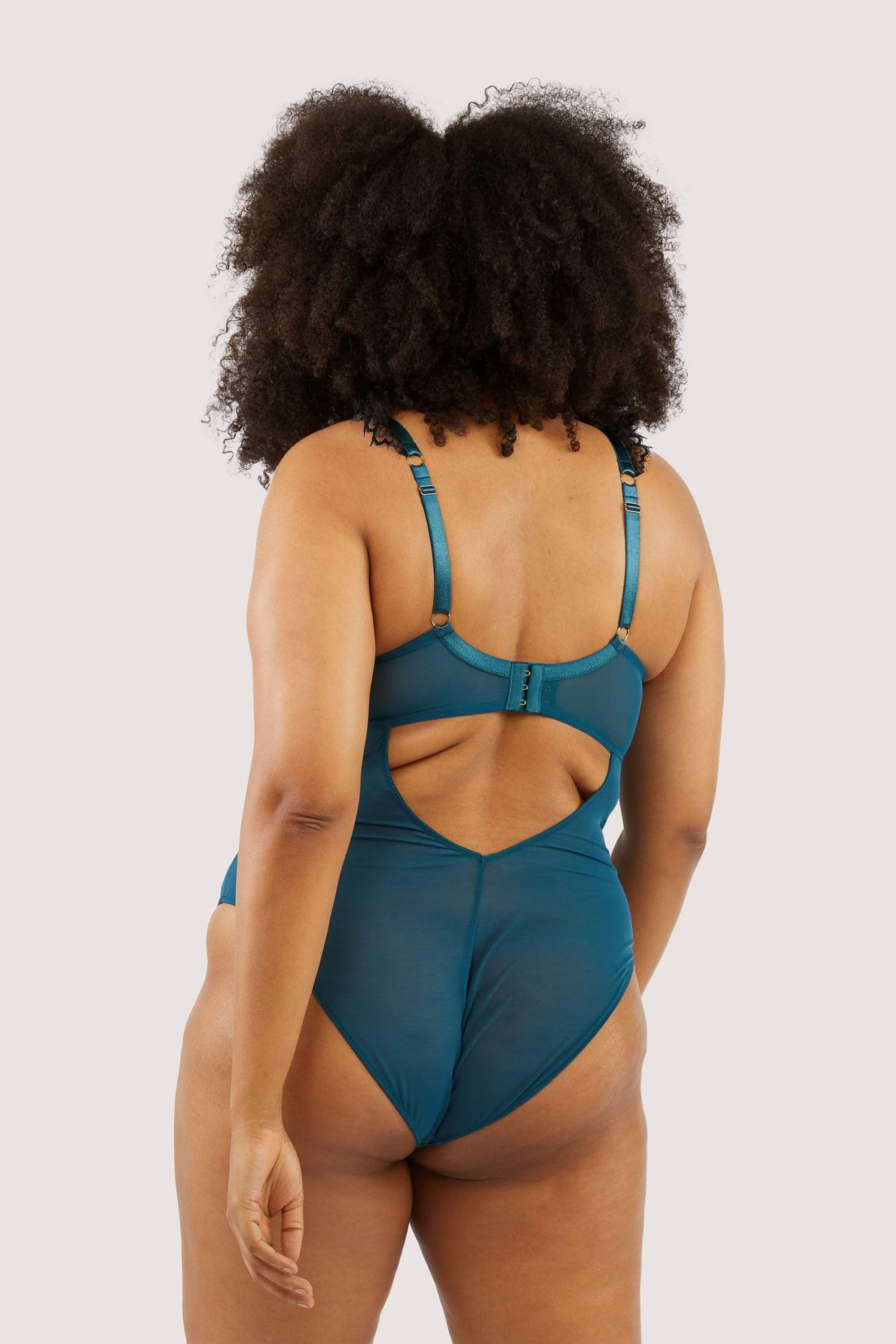 Feel glamorous in our Teal and Black Lace Bodysuit. With teasing teal mesh topped with beautiful black lace this bodysuit is calling your name! It features underwired cups for support, pretty lace detailing on the straps and a cheeky low cut back.