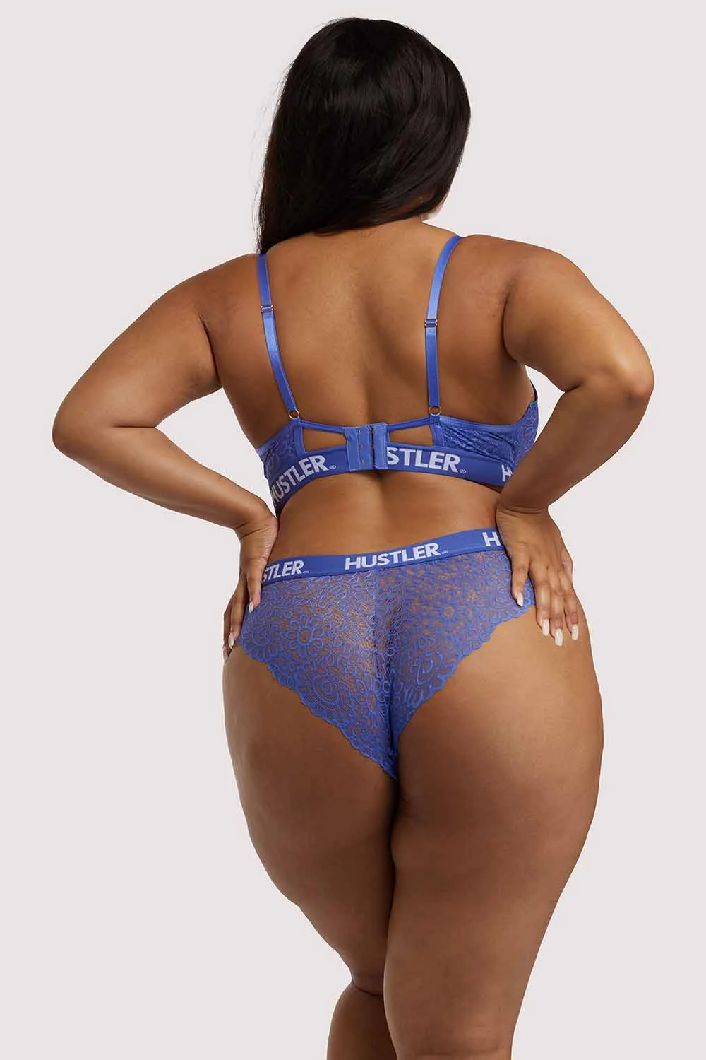 Brighten up your day in our Blue Hustler branded Lace Brief. Made of beautiful Blue lace finished with an elasticated banded waist with Hustler branding to give it a preppy look! Pair it with the matching Lace Bra for the full finish.