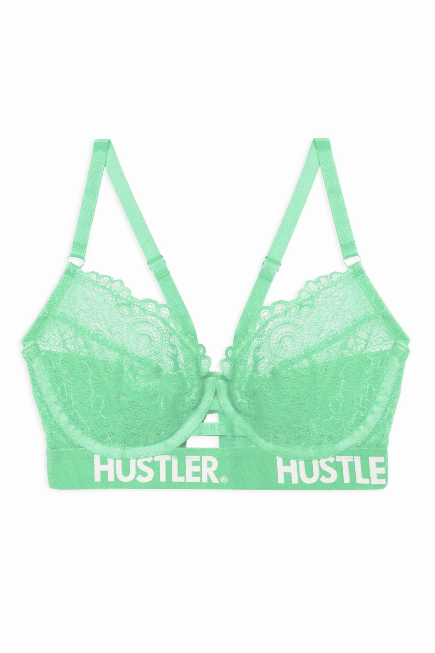 The Branded lace bra is unpadded, with floral lace cups. The band features a bold “Hustler” branded elastic. It’s the perfect everyday bra, with a twist!