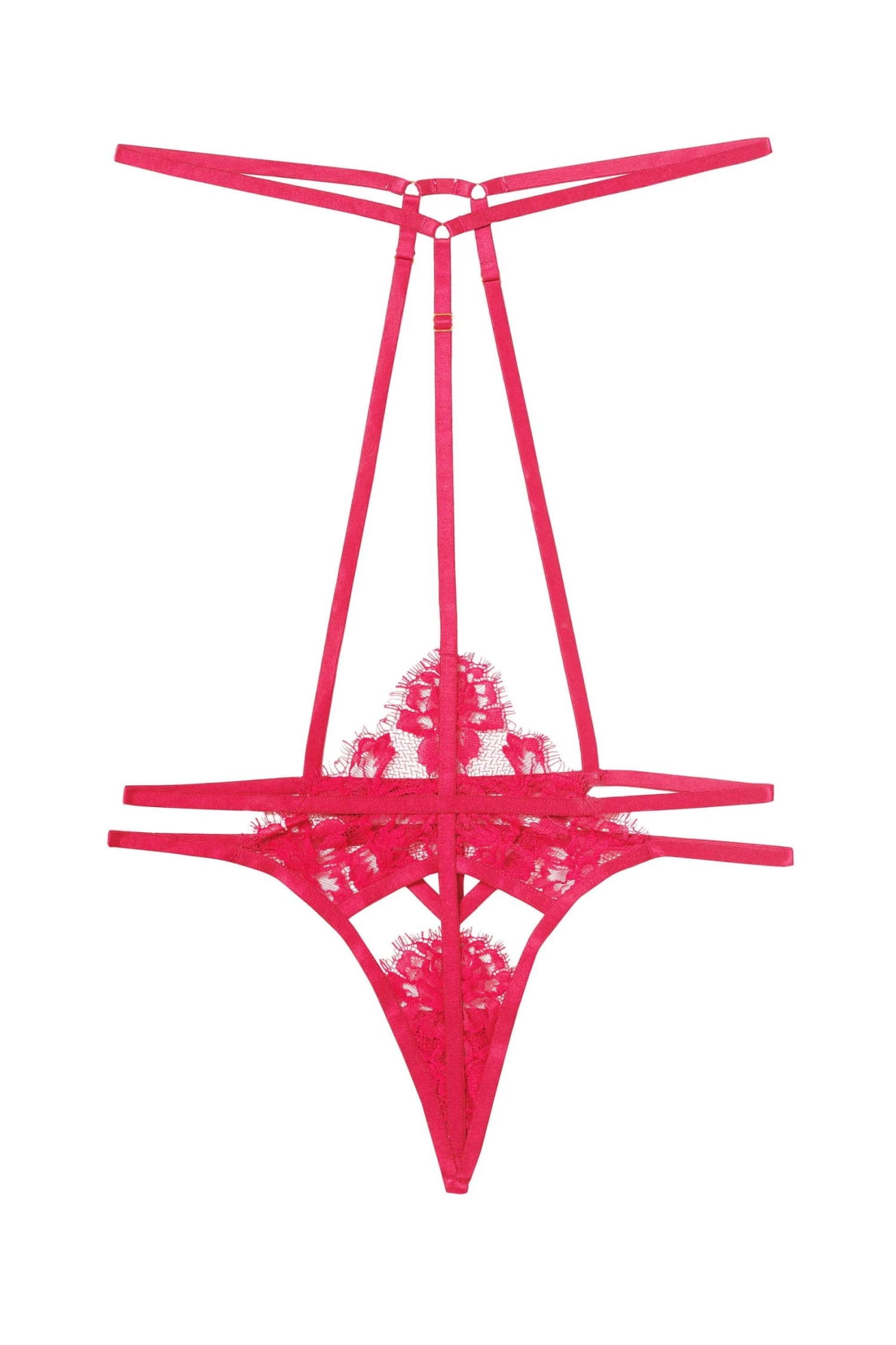I’m your Ch-ch-ch-ch-cherry bomb! The Cherry harness brief is for the daring. It features a strappy lace thong style, but with straps that go over the shoulder, almost becoming a bodysuit. For a super-sexy look, pair with red pasties!