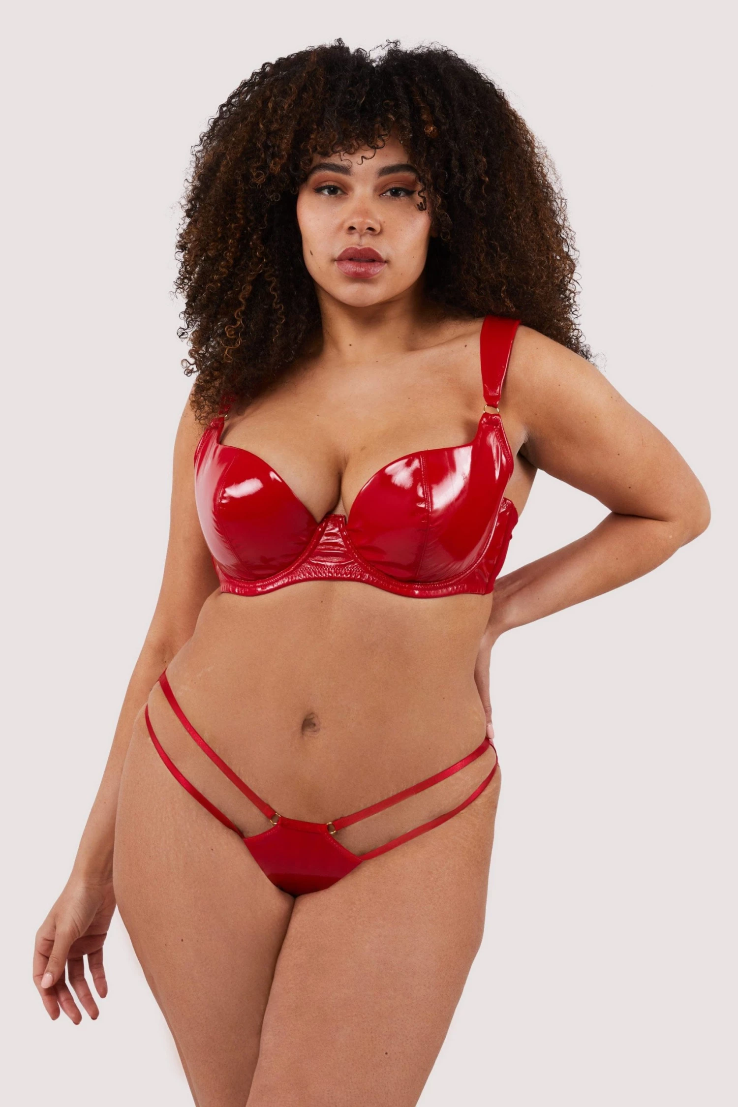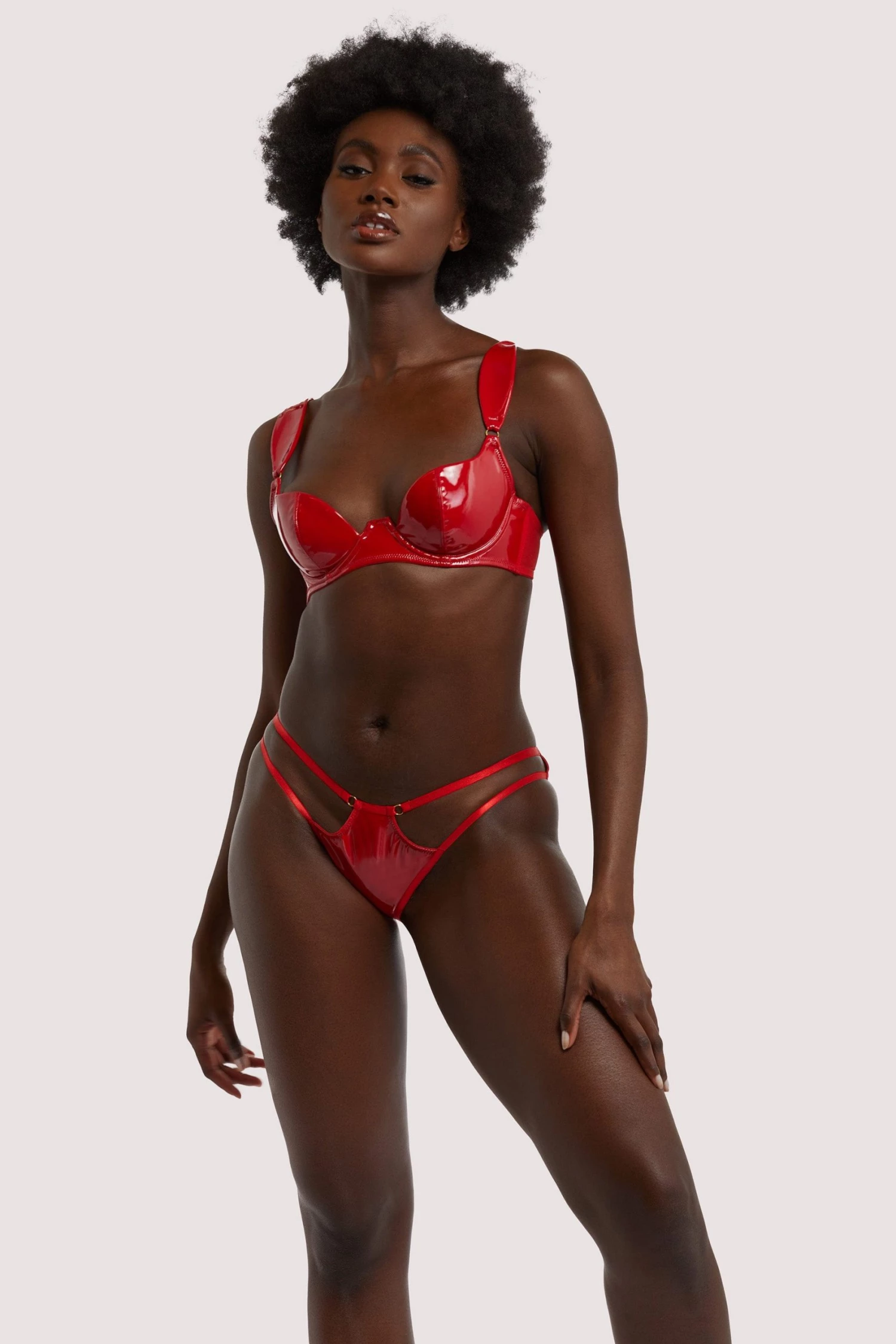Hustler Lingerie X Playful Promises is an exciting new line of provocative and seductive lingerie for women who aren’t afraid to flaunt their sexuality. Maxine is fulfilling your S&M fantasy! This PVC set is molded to show off your body. The brief is strappy and features cut-outs, as well as a red PVC backÂ