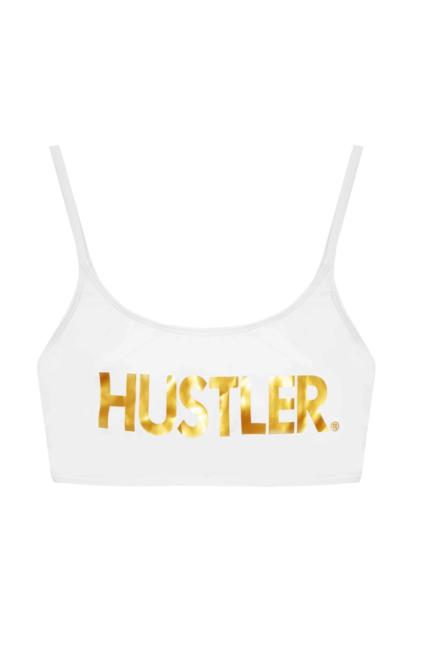 You can’t go wrong with a white bikini, featuring a gold Hustler Logo and a scoop neckline. Complete the look with the matching bikini bottom.