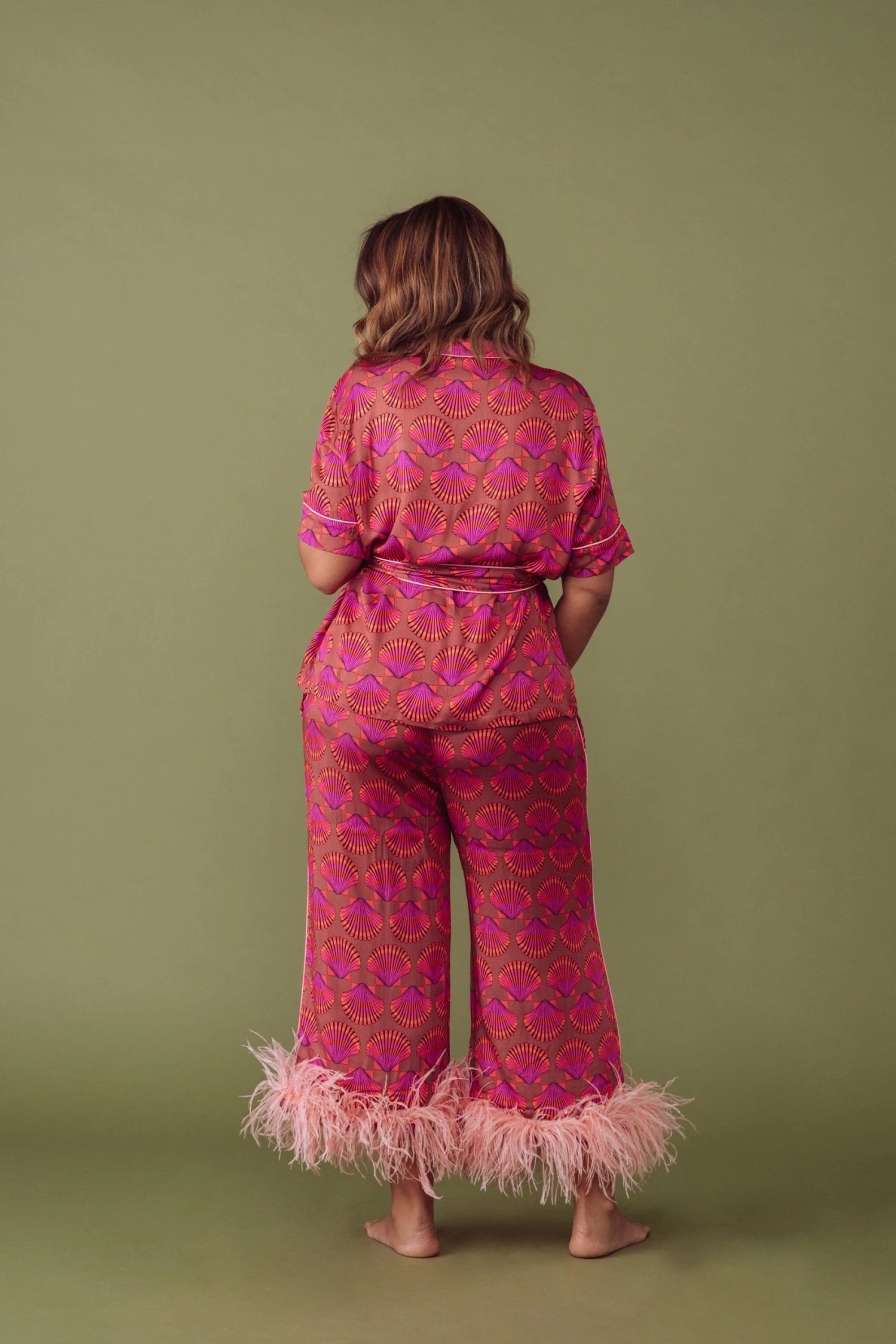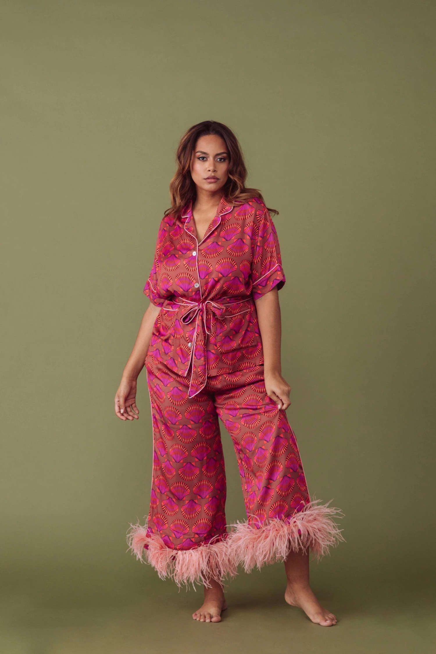 Embody elegance, comfort and style in this Kilo Brava nightwear set. Combining a gorgeous shell print and pink feather detail creating a dynamic, textured look. What’s not to love?Â