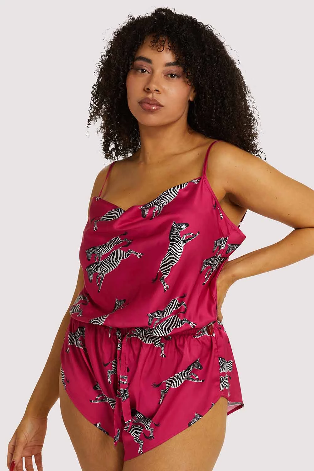 This sleep playsuit has a retro-inspired silhouette with a cheeky fit and a drawstring tie to cinch in at the natural waist. Cowl neck detail and adjustable straps with gold hardware. Digitally printed