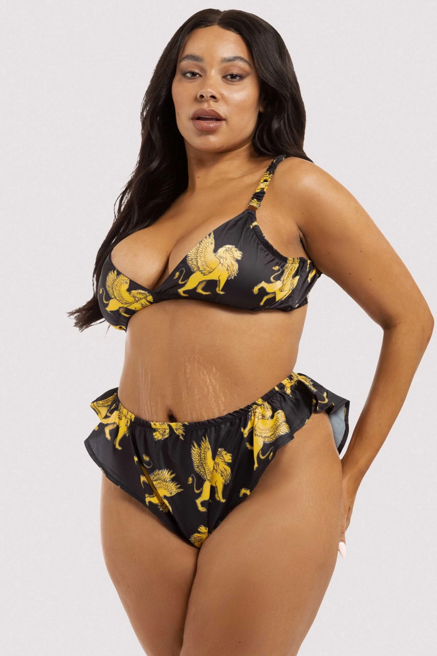 Panty? Tap shorts? It’s a combo of both. This flutter panty inspired by vintage silhouettes feels so fresh. Comfortable enough to wear as panties or for lounging. High waist and high leg silhouette with a flirty flare at waist thanks to it’s bias cut. Contrast bright lilac piping. Digitally printed with Kilo Brava’s exclusive hand painted Lioness print.