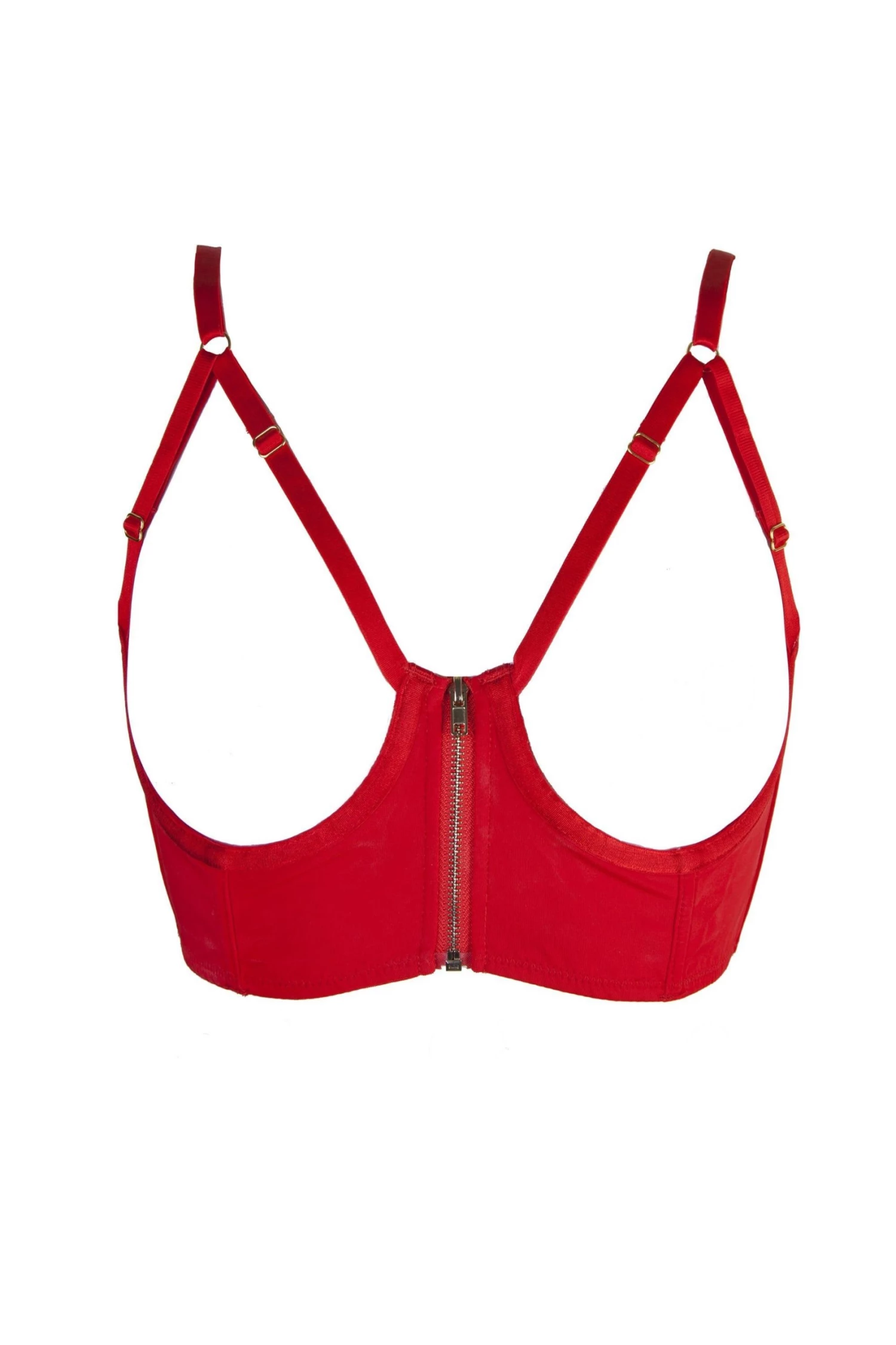 Drop jaws in the sexiest addition to your lingerie drawer yet! Meret bra features a red-hot colourway, longline cut, and a zip closure at the front. The cupless cut is screaming lust and seduction, and Meret can also be layered either under or over your outerwear. The bra is further adorned with adjustable harness detail along the straps and satin piping along the underbust.