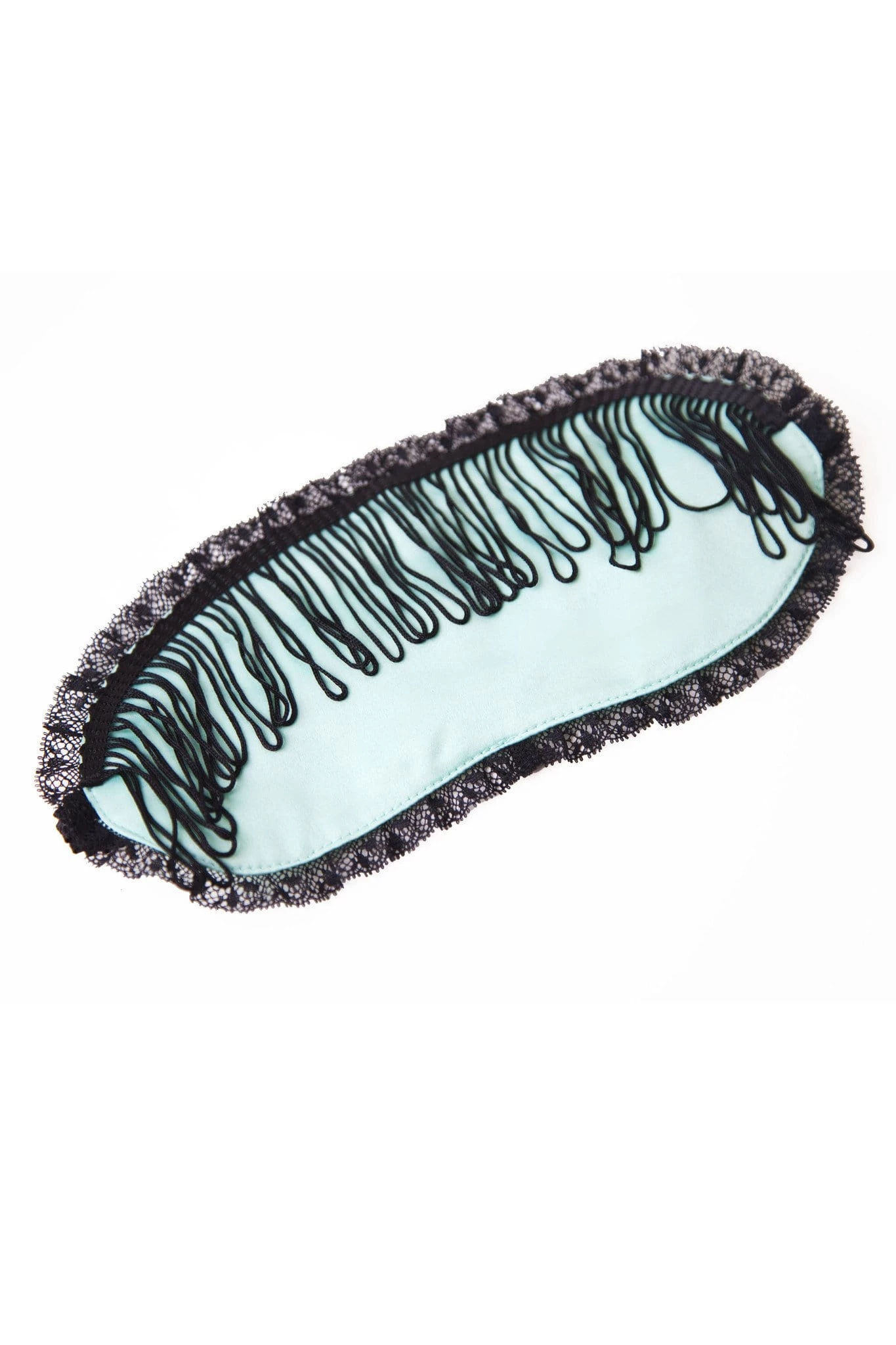 A silky satin eye mask edged with lace, featuring black fringing across the top.