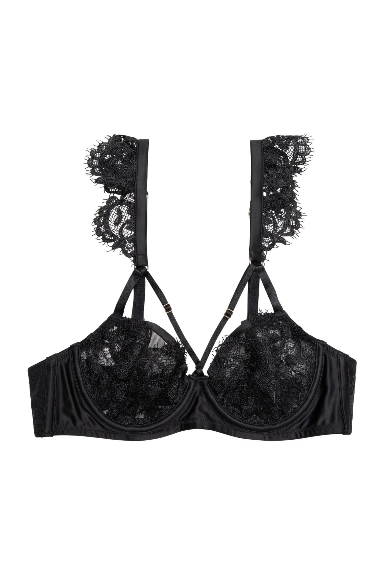 Strap in! The Anneliese set features ravishing black lace and mesh. The harness straps across the chest enhance your decolletage while the lace frills on the straps give this set an ultra-flirty look.