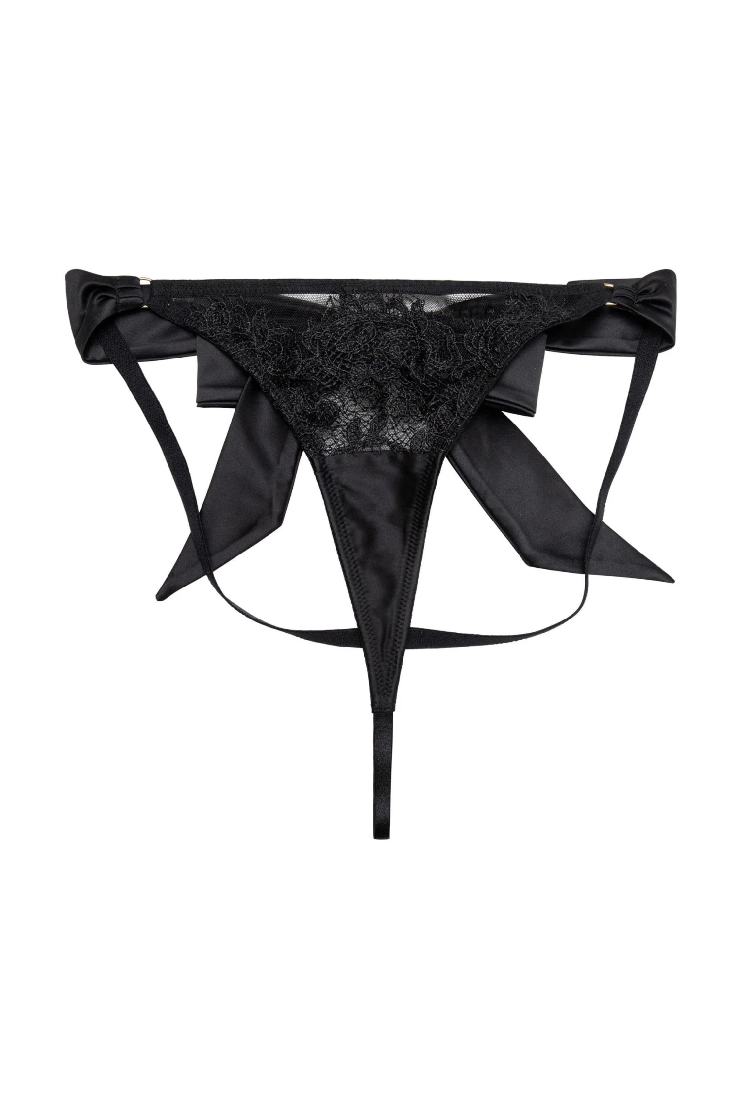 Va-va-voom! The Anneliese set features ravishing black lace and mesh. Satin straps adorn the hips on this luxurious brief, with a large bow at the back making you look like the gift you are!Â