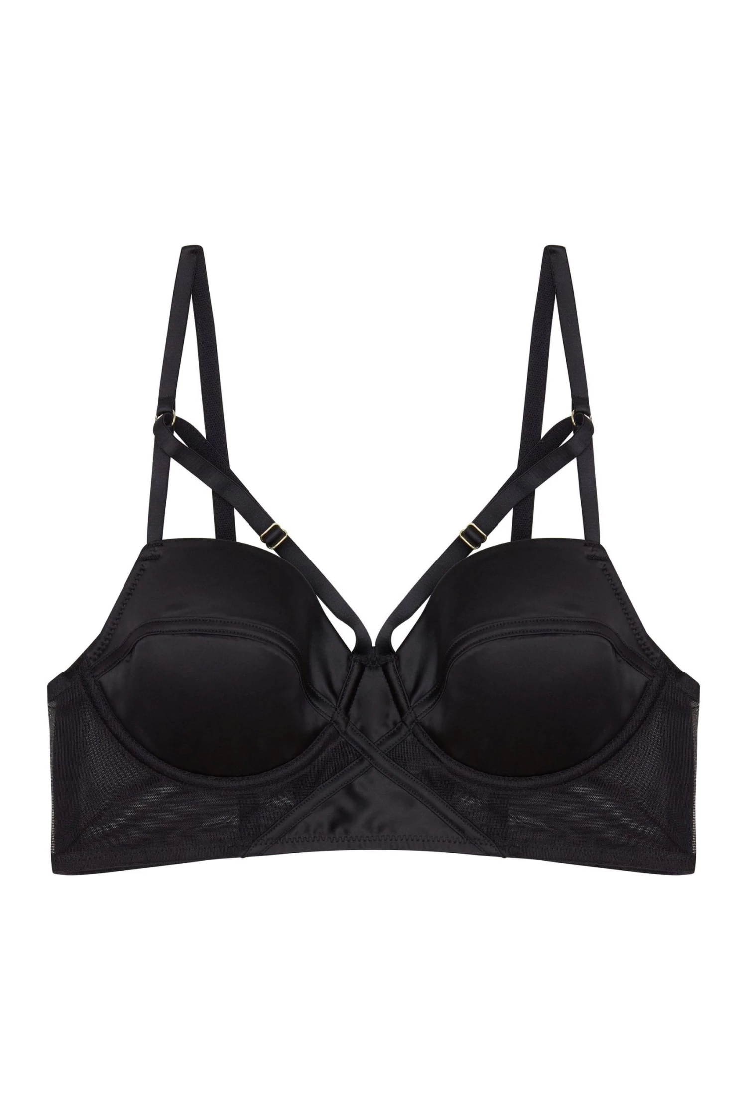 Become an unstoppable force of nature in the black crossover longline bra. A mixture of mesh and satin provides a cradle style never before seen. Underwired, padded cups and side boning give a support like no other, relish in empowerment at its maximum!