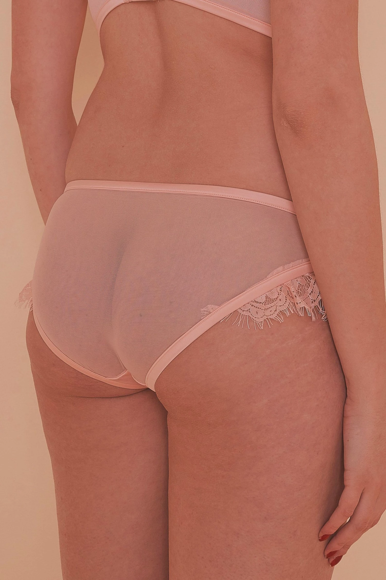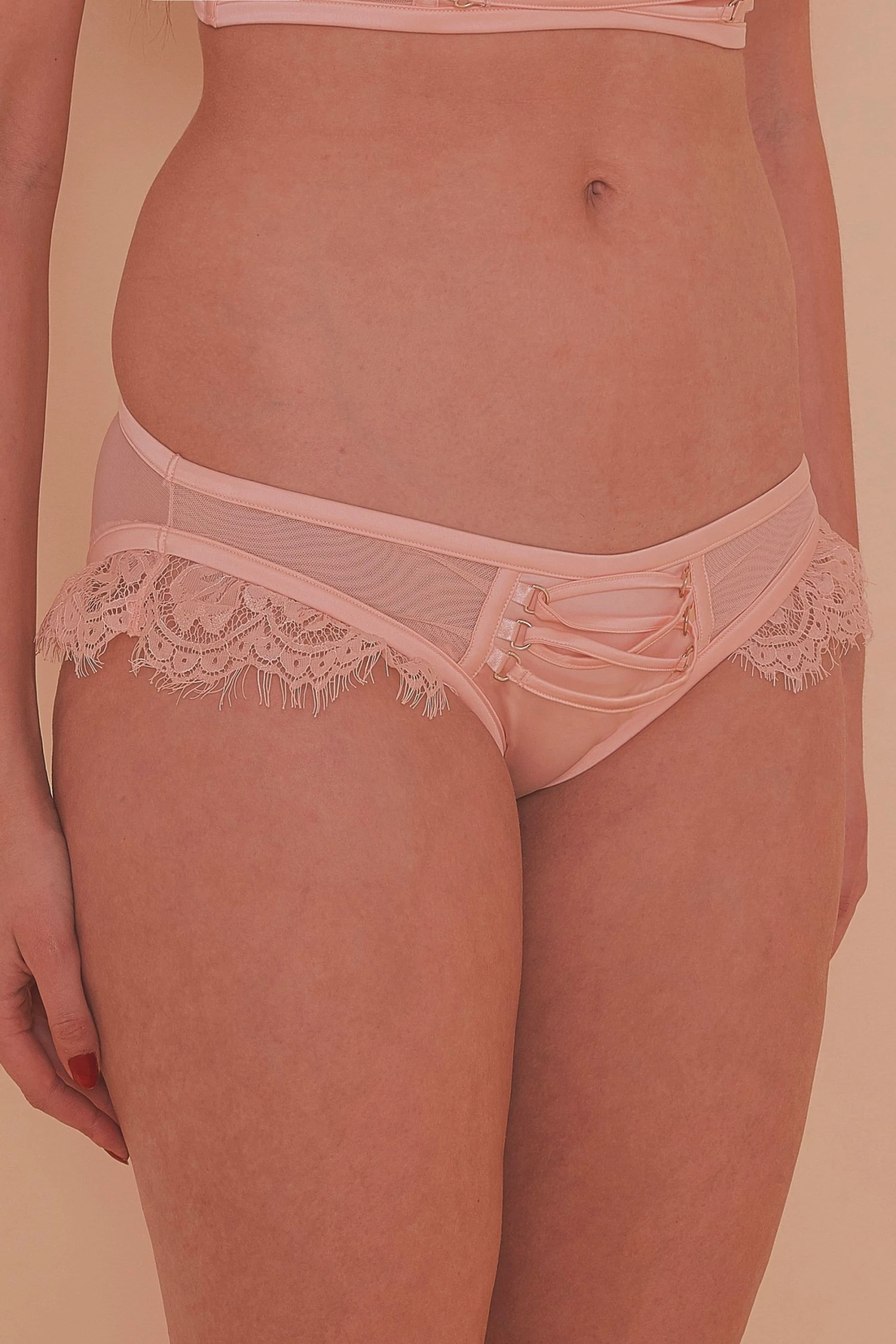 Create a vision of seduction in our Bernadette brief in timeless classic peach! The peach hue exudes vintage glamour, with the brief featuring soft satin front, mesh back, and lashings of sexy eyelash lace trims along the hips, emphasising lush curves. The brief is adorned with a racy corset lace-up detail at the front.