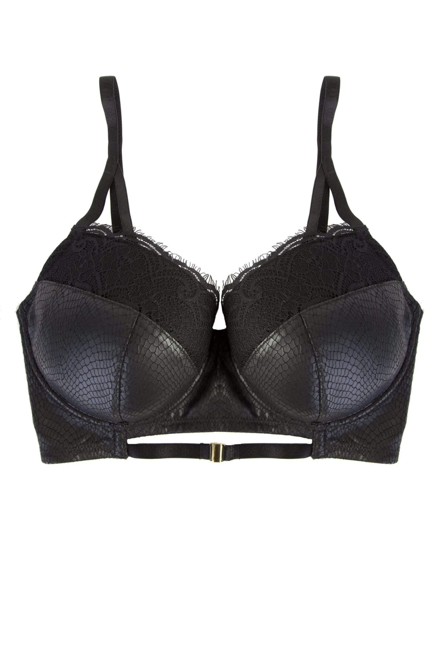 Exude sex-kitten attitude in our drop-dead seductive Aerona. The bra features thicker padding for greater support and more pronounced va-va-voom curves, and is covered in head-turning faux-crocodile print leatherette fabric. The cups are trimmed by a deep layer of lush floral lace, and the band and the straps feature sexy fetish-inspired strappy details. Aerona has stronger mesh at the back for greater support and fastens with a series of hooks and eyes at the back.