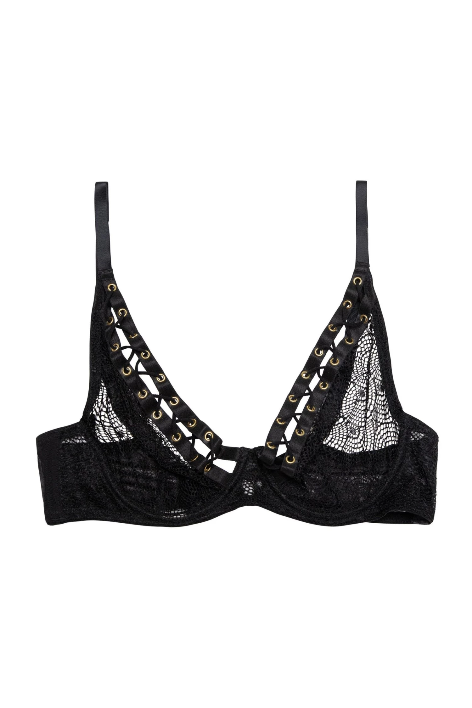 Lace-up your lingerie! The Florence set is for steamy nights. Geometric, circular lace is featured all over, which contrasts with the lace up detail on the trims. The laces are made up from elastic string, perfect for getting your dream look.