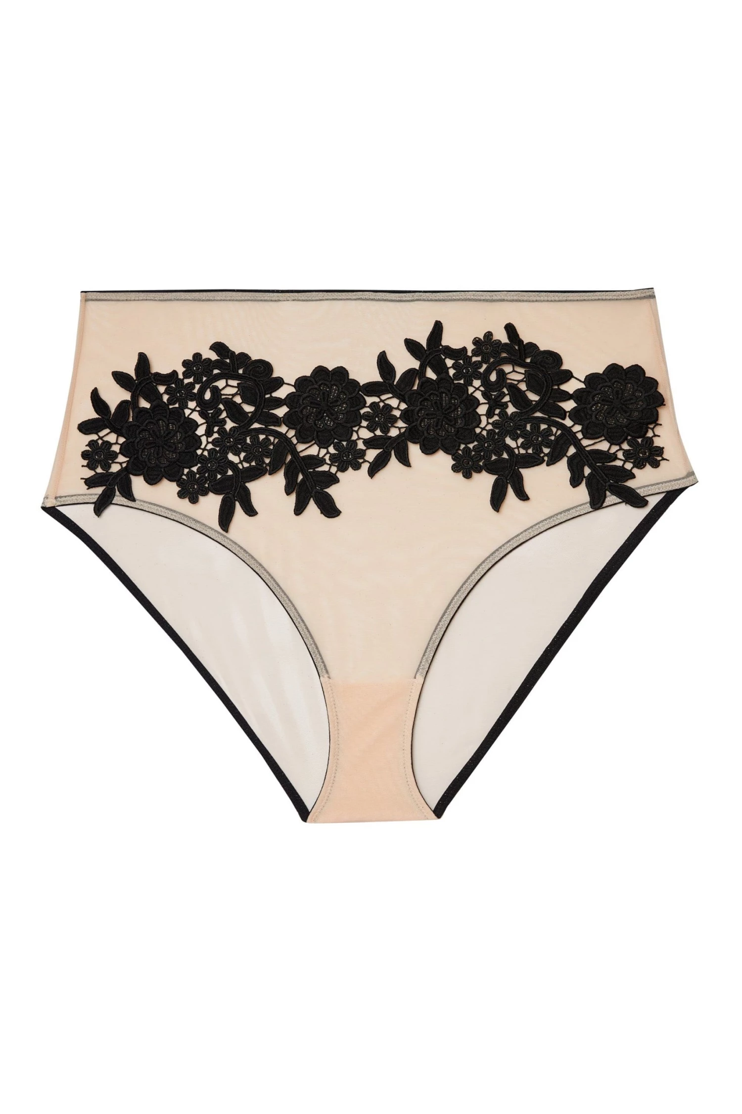 Alaina is bound to raise pulses. It provides a stunning illusion with black floral guipure appliqué over transparent beige mesh.The Briefs are high-waisted which hugs your curves in all the right places. For a complete set, pair with the Alaina Bra and Suspender Belt.