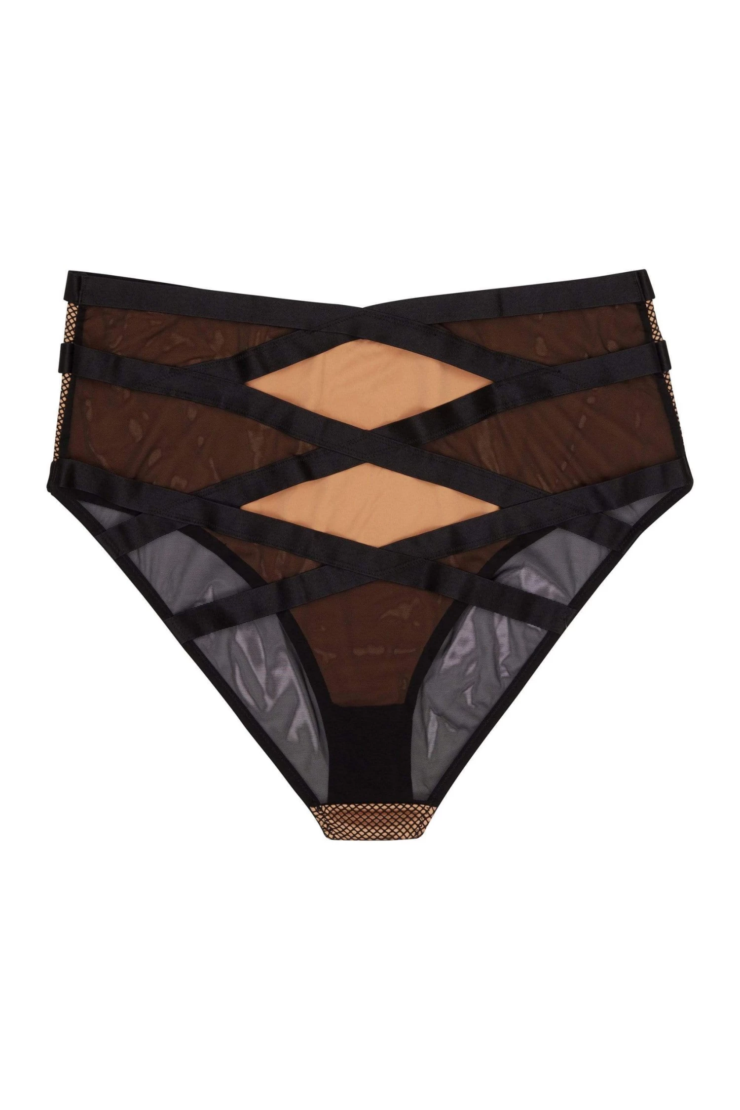 Feel like a fierce rock’n’roll babe in this Strappy Fishnet set! Black fishnet is layered over contrasting beige mesh, with thick black strappy detail across the brief. The back features some cheeky cut-outs for a naughty peek of skin