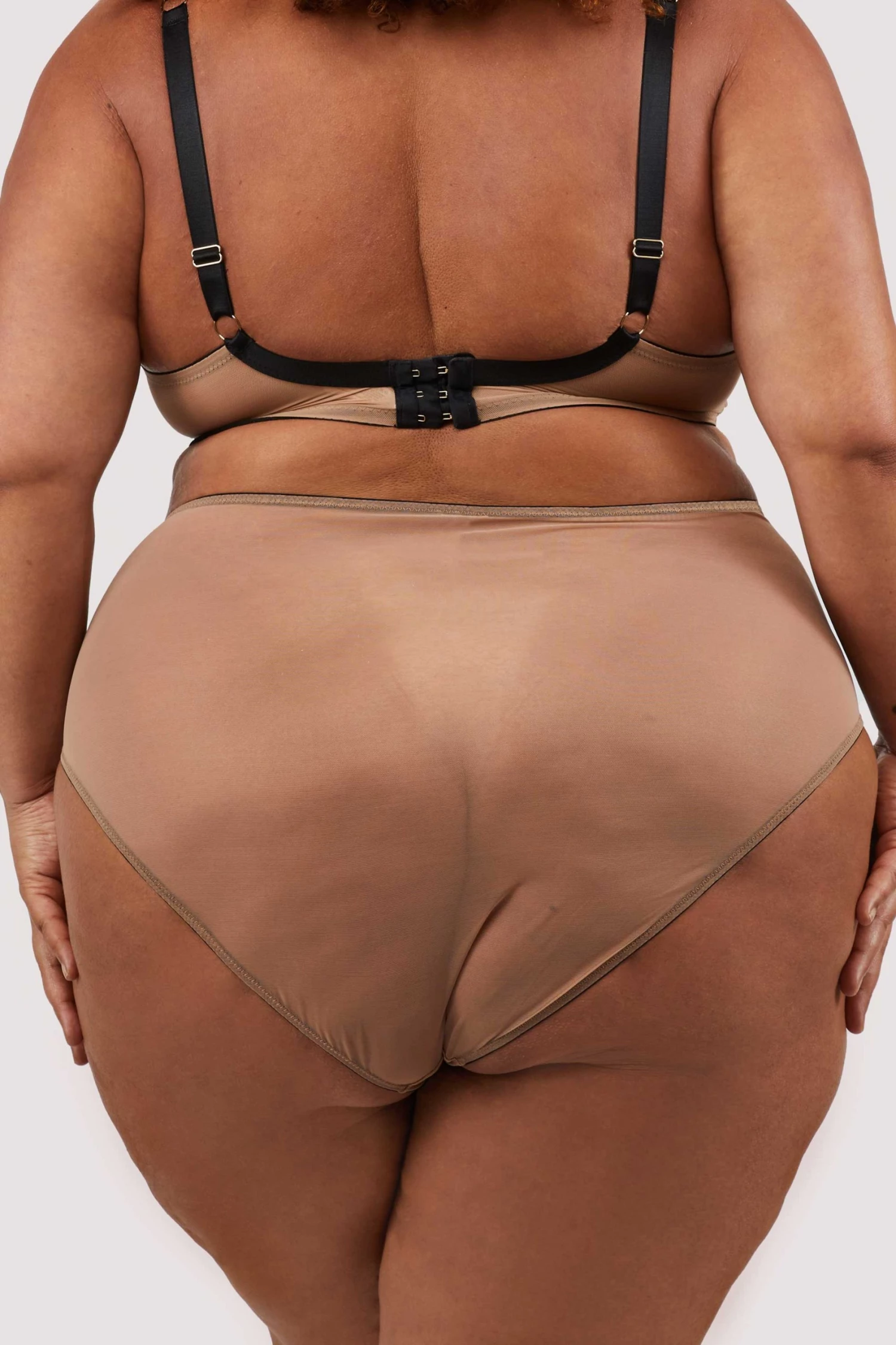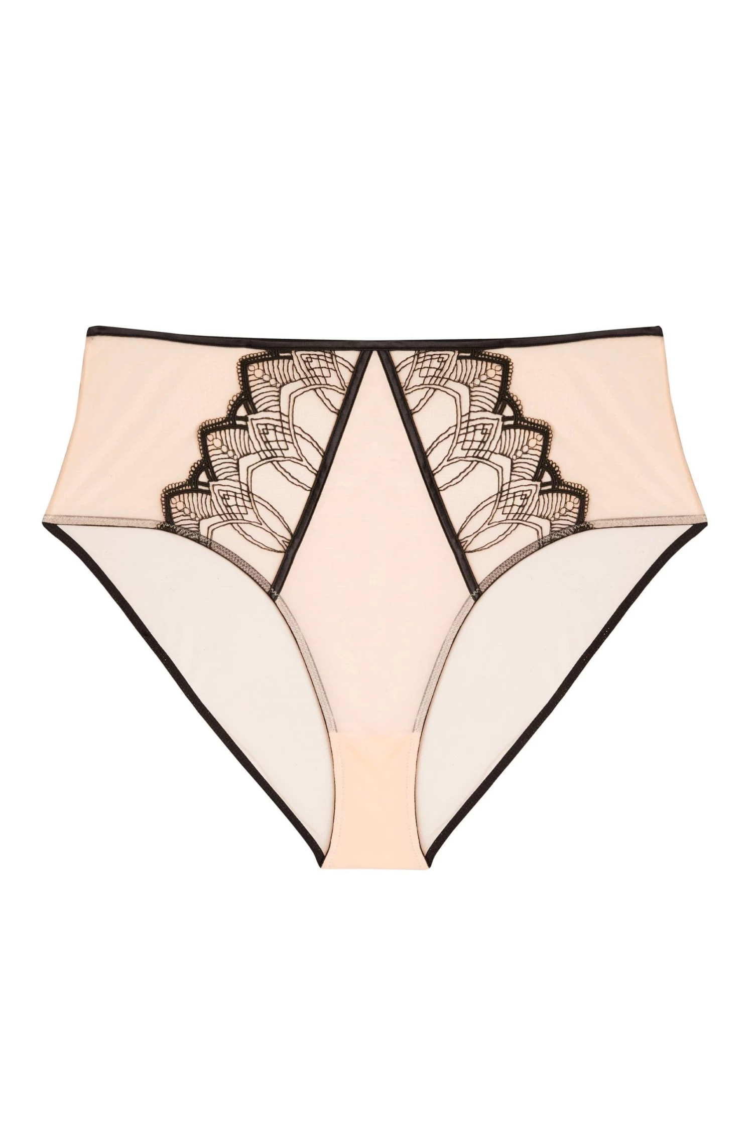 The Clara Brief is embellished with exquisite lace giving it a luxurious touch. Made from sheer beige mesh in a high-waisted style these briefs will hug your curves in all the right places. Match with our Clara Harness and Bra for a complete luxe look.