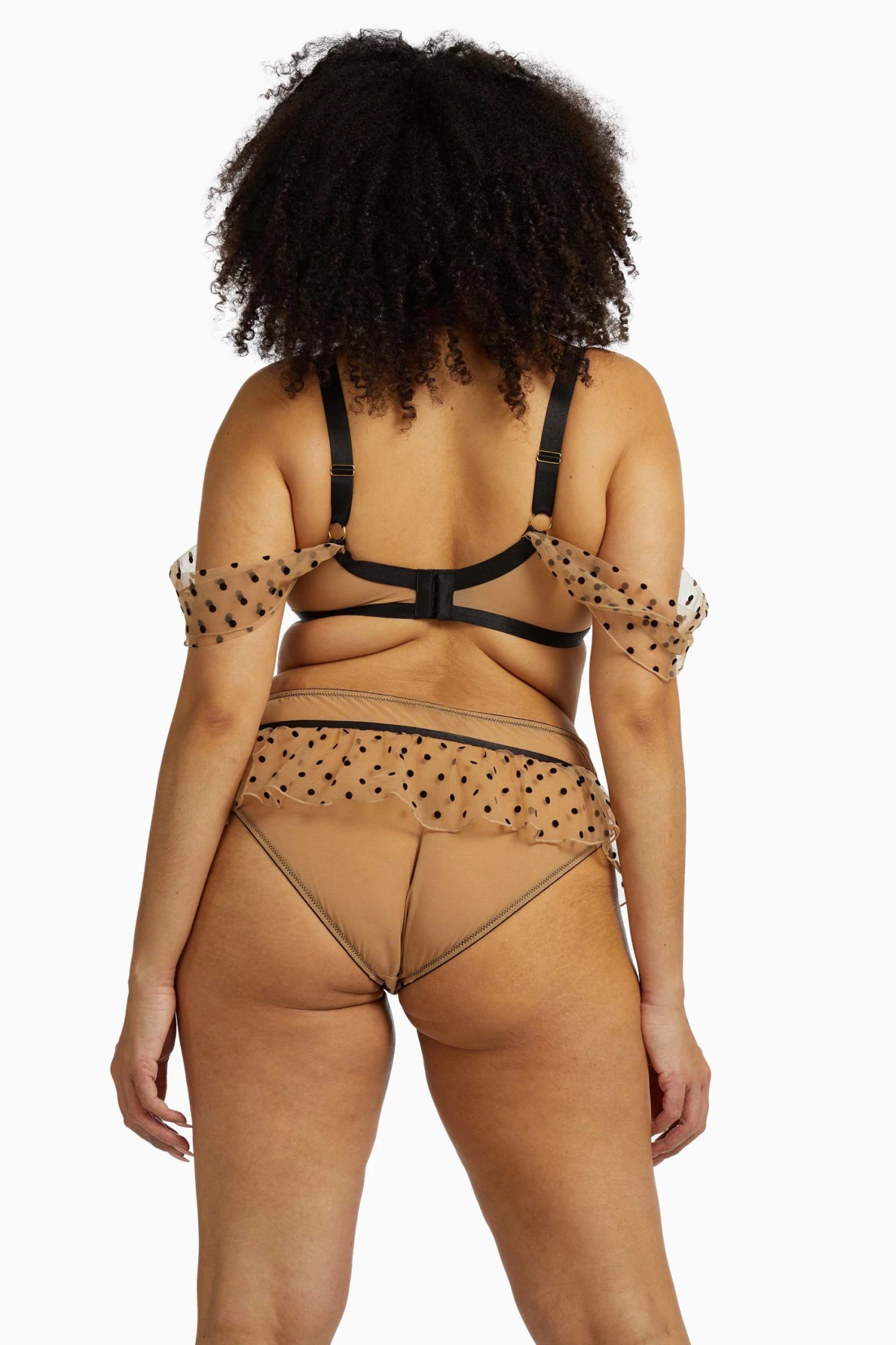 We’re going dotty over this set! The brief features a super-cute tutu trim around the hips to enhance your curves and add a ballerina touch. The brief is caramel-hued mesh with black polka dots and is finished off with a black centre bow.