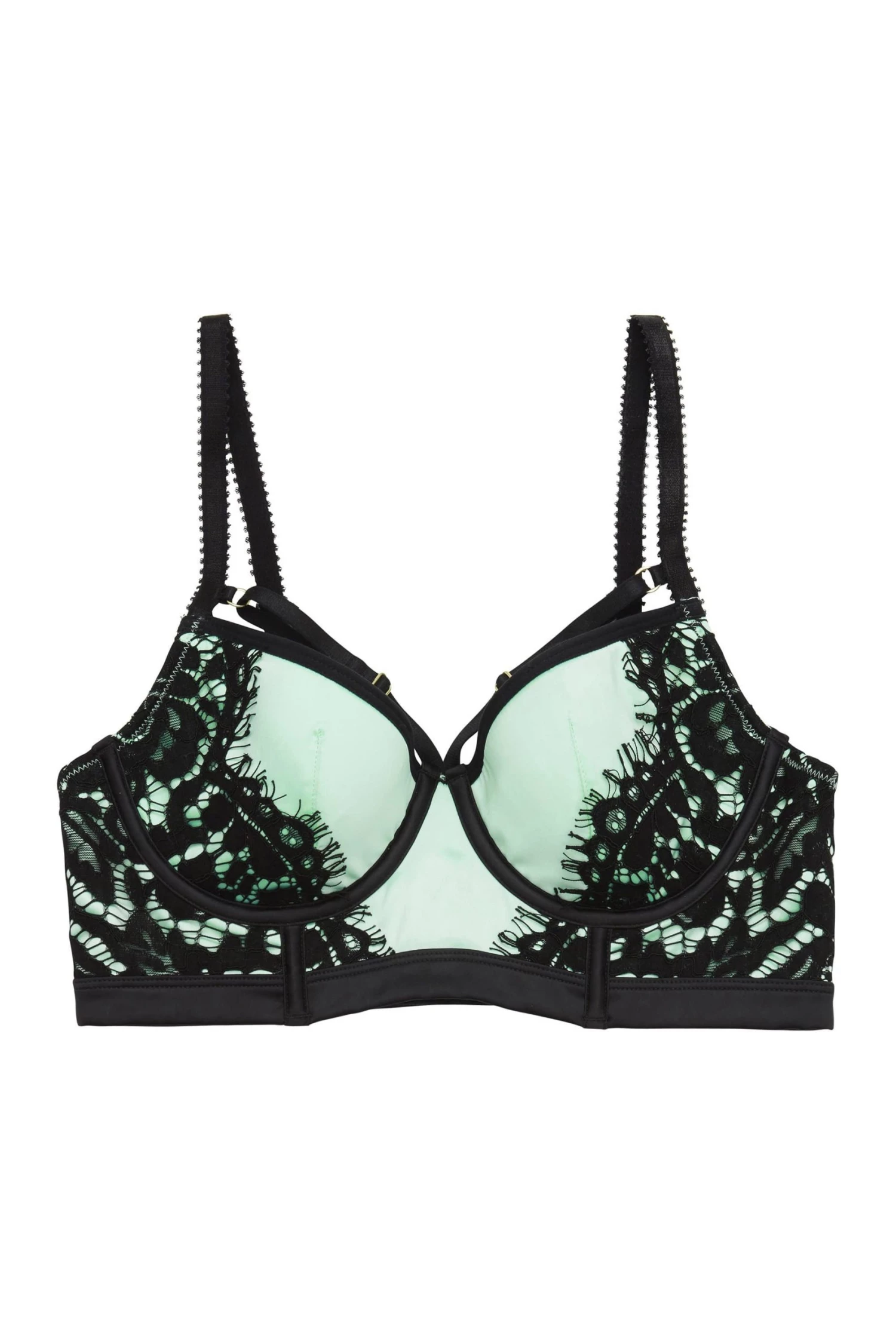 Indulge in classical romance in our Hedy range. It features a mint, stretch satin, longline bustier bra engulfed in black embroidered lace with an elegant eyelash finish.