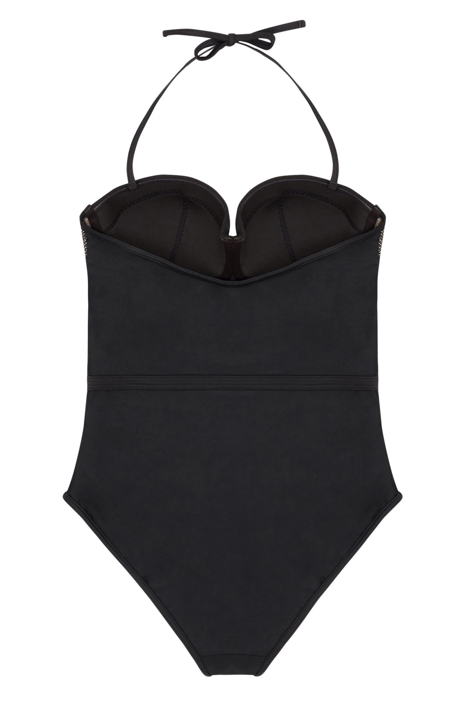 Channel your inner vamp in this curvaceous number! The swimsuit features full coverage cups and panels in classic black along front panel and back, and is further adorned with wide net fabric covering caramel-coloured mesh base. The swimsuit features a criss-cross strap detail along the sides, and removable ties behind the neck.