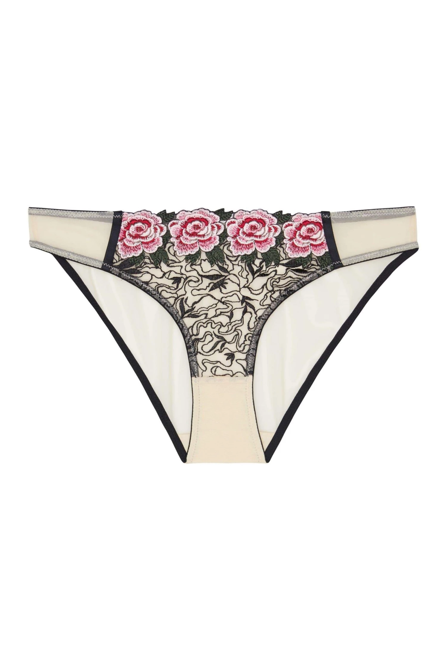 Find yourself in a floral wonderland in the Katy set! Pink roses are embroidered over a cream-coloured mesh, with abstract black embroidery over the centre panel. The sides and back are in sheer mesh to give a cheeky peek of what’s beneath.