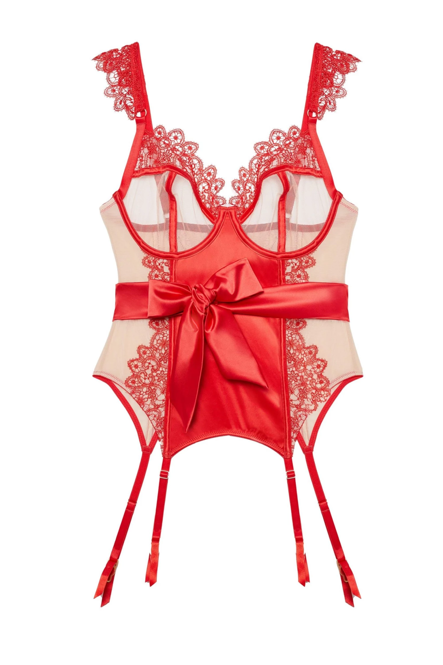 Turn heads in our Anaise Red Basque. This racy red Basque is lined with nude mesh and finished with red lace. Wrapped up like a gift for your partner the red bow ties it all together. Match with our Thong for the full flirty finish.