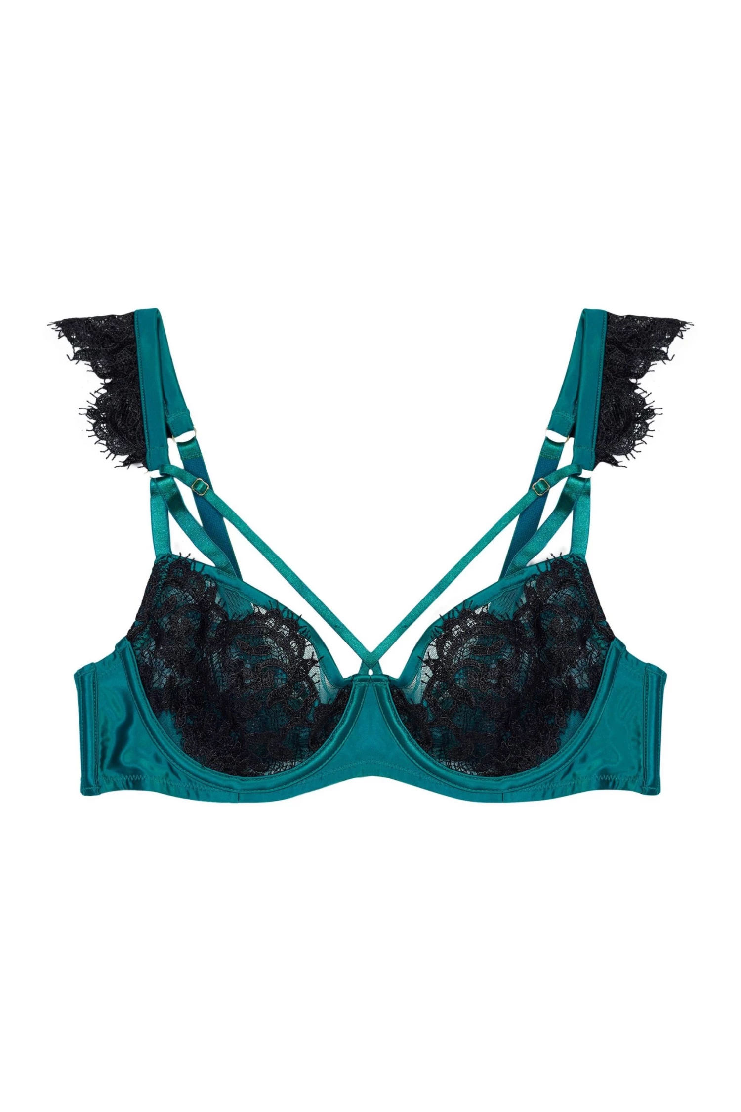Strap in! The Anneliese set features ravishing Teal lace and mesh. The harness straps across the chest enhance your décolletage while the lace frills on the straps give this set an ultra-flirty look.