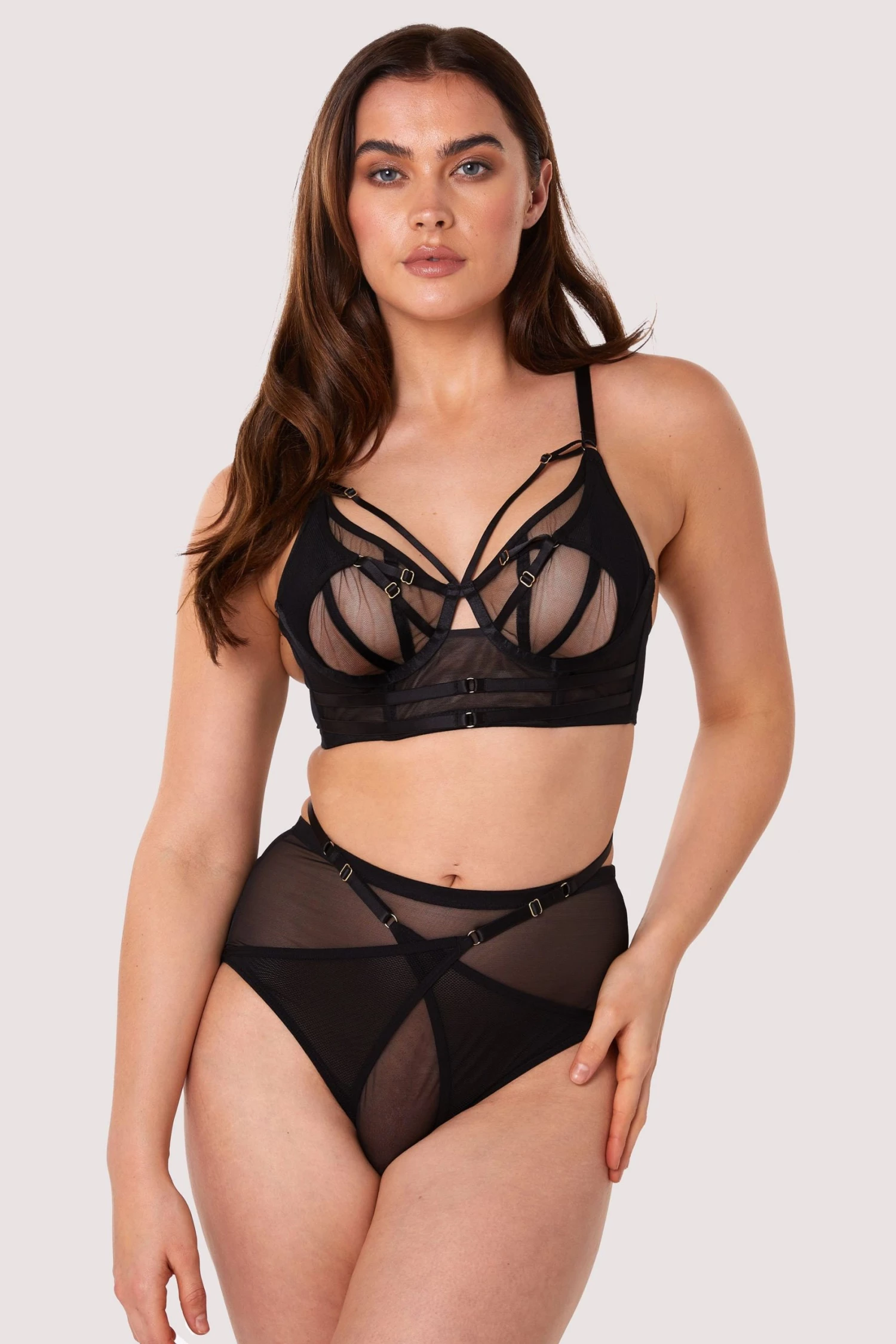This ultra-strappy number is bound to get hearts racing! Featuring classic black mesh with fishnet panels, and satin elastic harness detail. Each strap is adjustable to get you the perfect look.