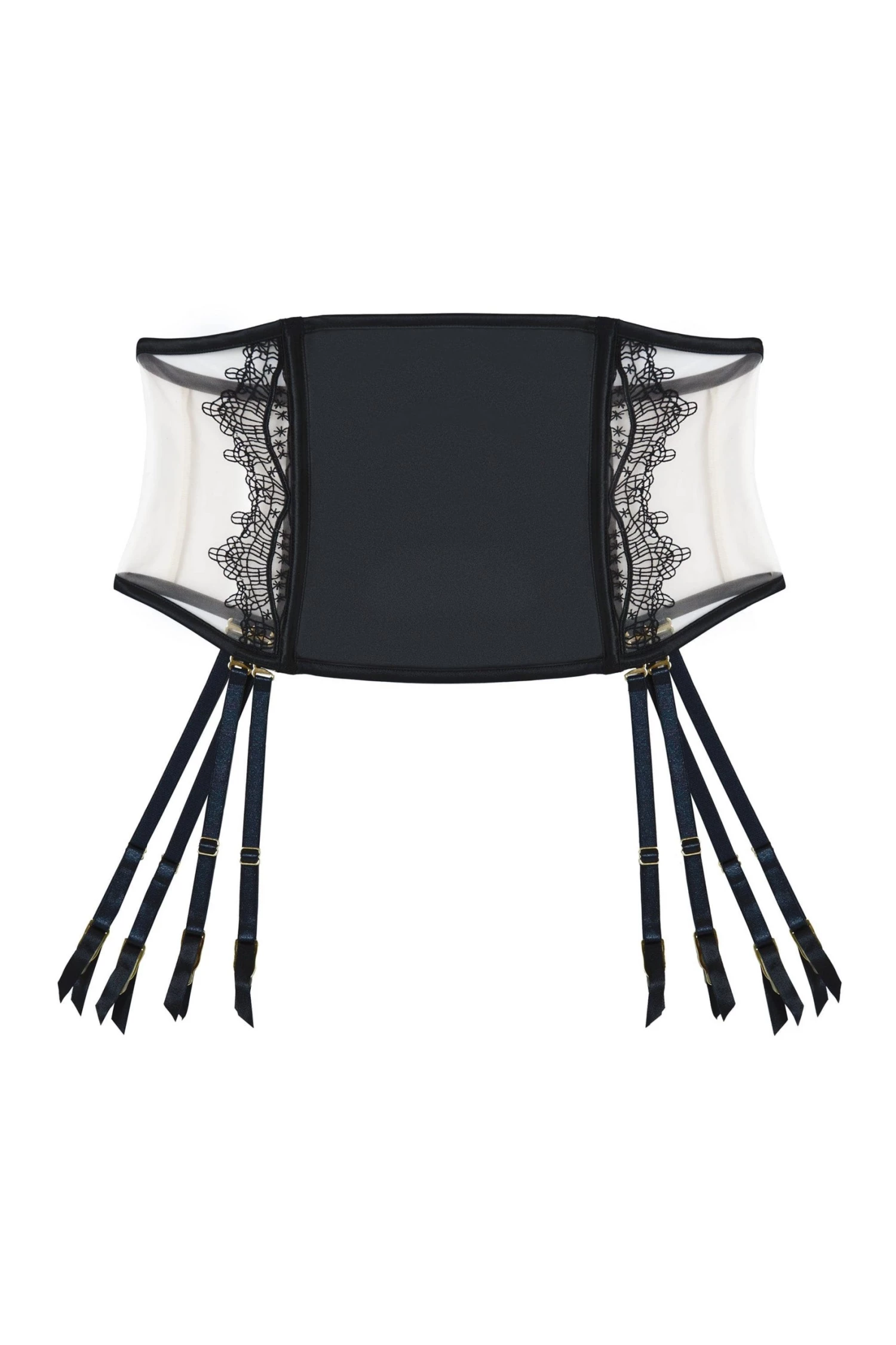 The power combination of satin, lace, and mesh.. introducing the Wren Black Illusion Mesh and Satin Waspie. Featuring a beautiful satin centre with intricate lace detaling, and transparent mesh sides. This stunning piece creates a barely there illusion whilst also providing support. The perfect final touch to the whole set.