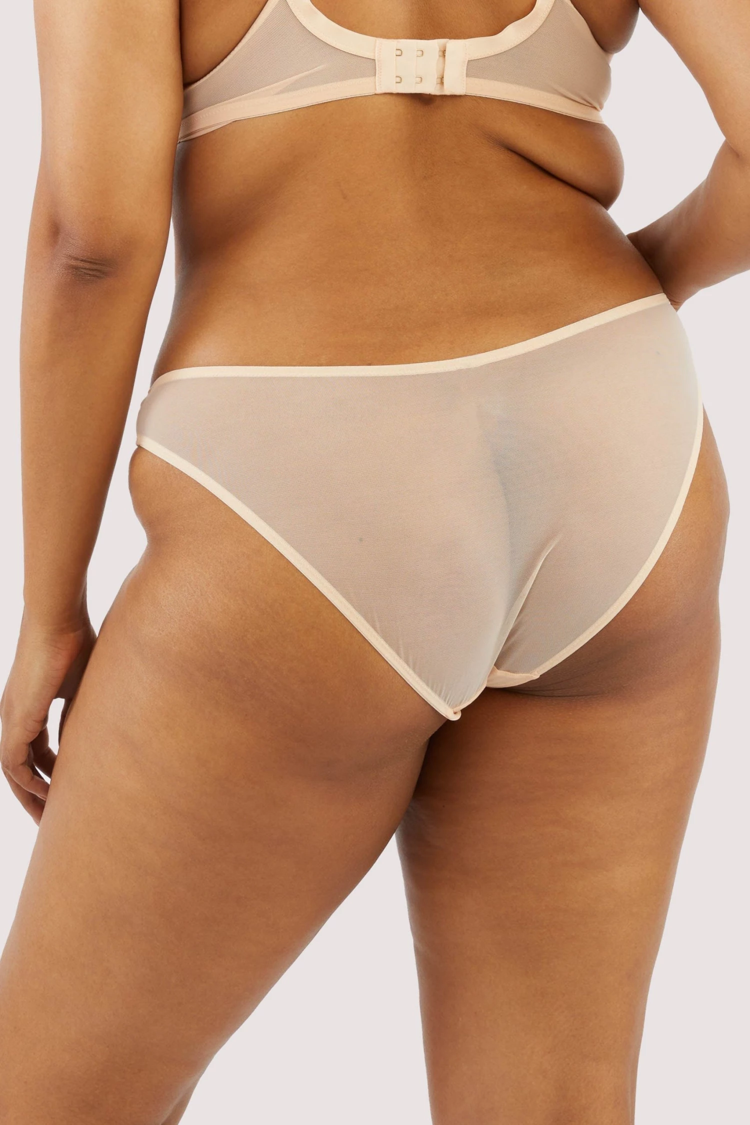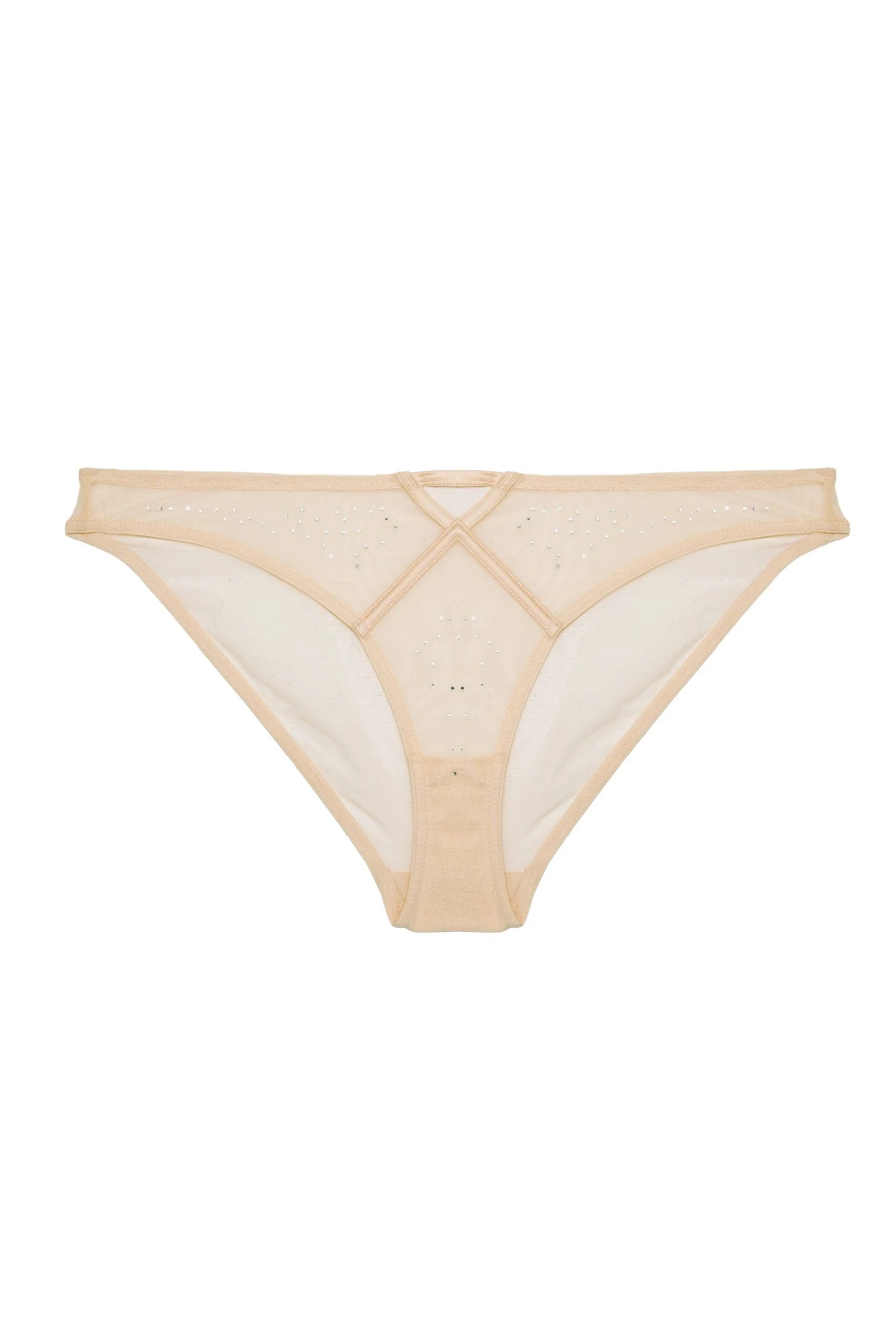 Introducing the Nola Toffee Diamante Studded High Leg Brief. This angelic new set comes in a yummy light toffee colour, and features an array of dainty diamantes on a delicate mesh. The brief also features a beautiful triangular cut out in the centre.
