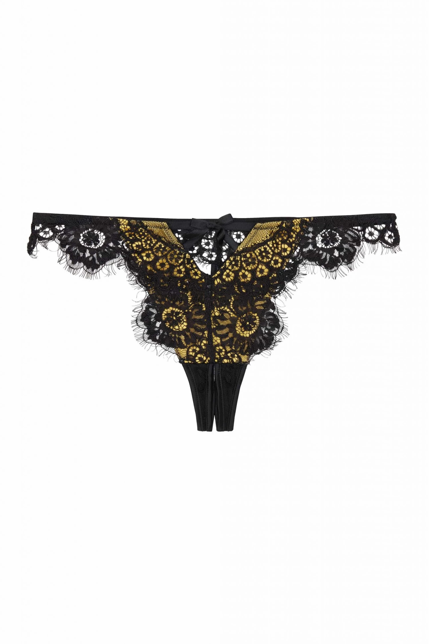 The Mustard Contrast Crotchless Thong features bold floral lace overlaying matte yellow satin. The thong is embellished with a black bow in the centre. The sunny-yet-sexy vibes of this set are sure to get you in a good mood!