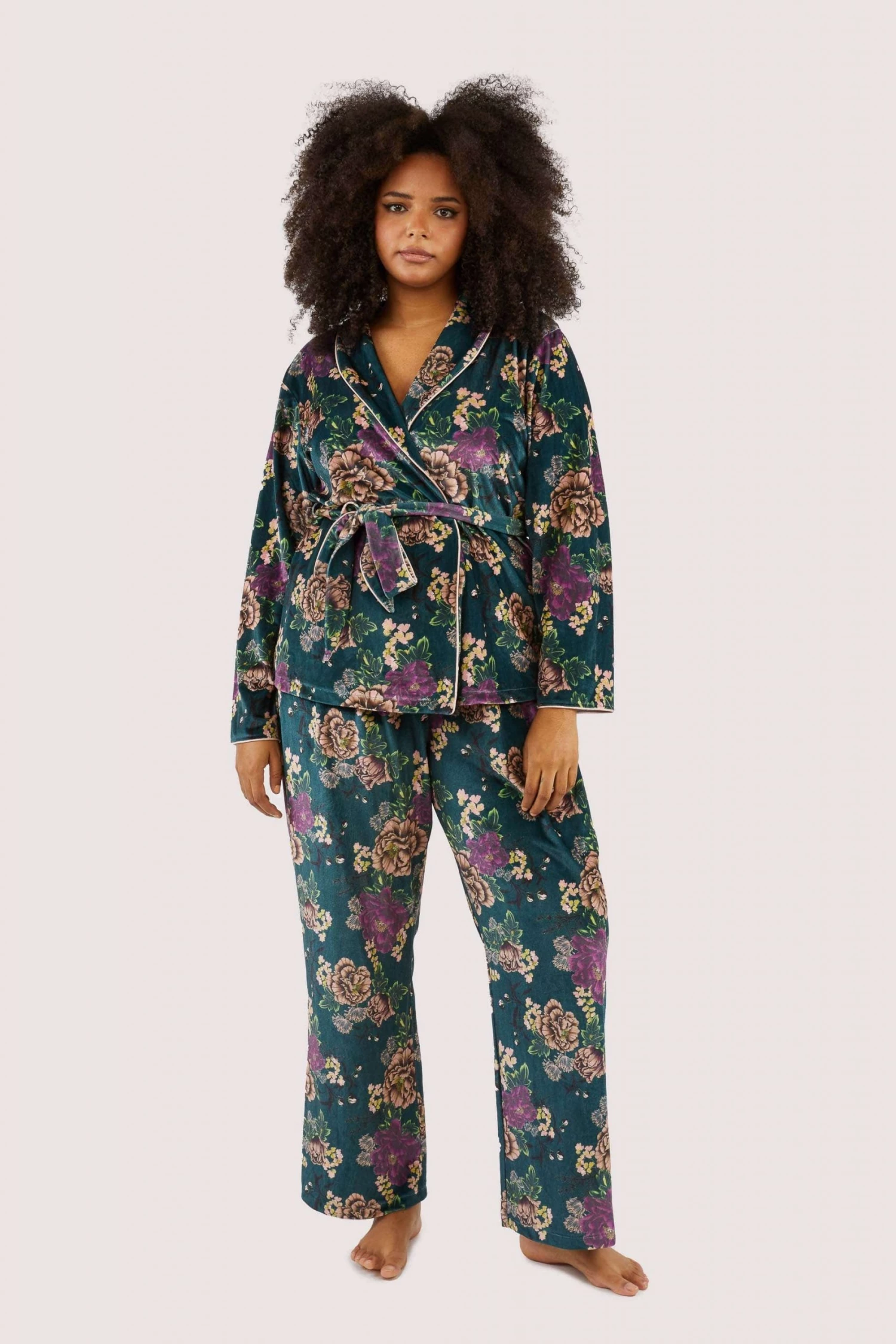 Keep your style on point even when you’re lounging with these floral printed velvet PJS. With a loose lapel collar, and wraparound top with tie waist , it’s the ultimate in stylish sleepwear. The velvet PJ pants are elasticated for maximum comfort with a wide leg and beautiful natural gather at the waist. Snooze in style!