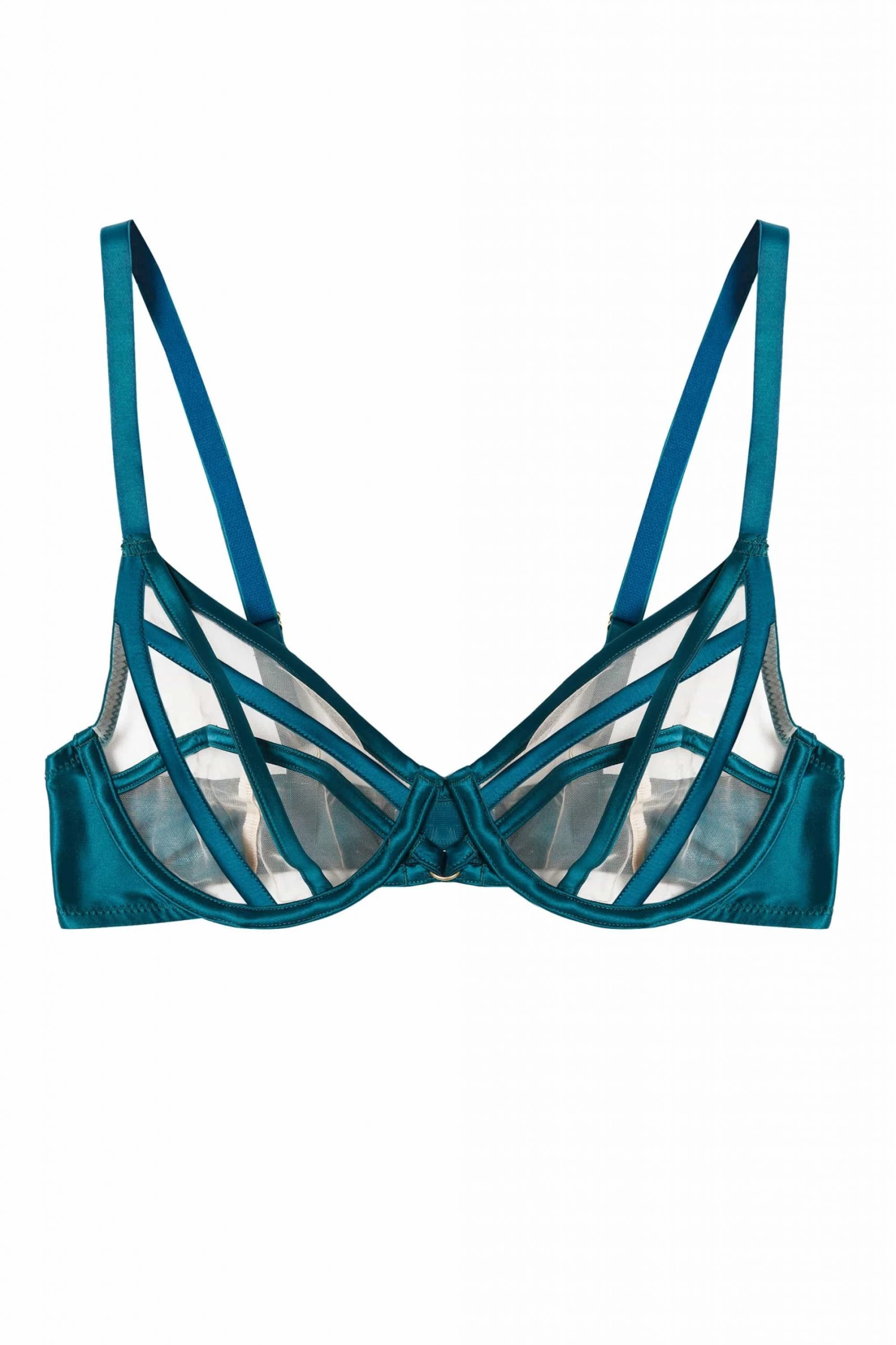 Introducing the unforgettable Ramona Teal Strap Detail Illusion Mesh Bra. The mesh cups and luxurious teal satin crossover detailing creates a barely-there illusion that is sure to turn heads. This piece is designed to illude and support you at the same time.