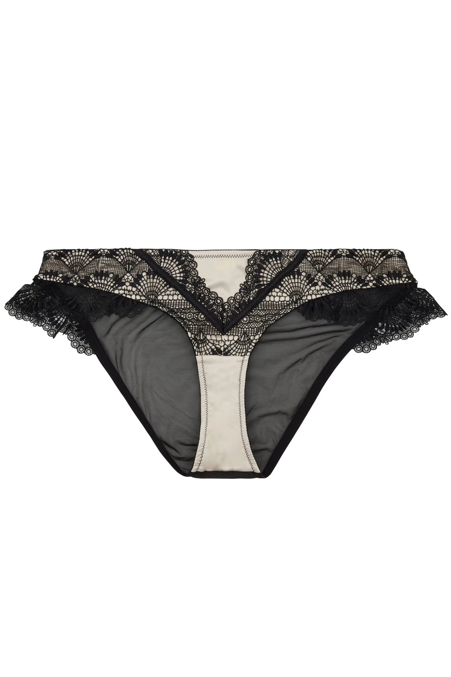 Ysabel is the perfect lingerie-drawer staple! Peach satin is completely overlain with black fan lace and skirted with mesh lace.