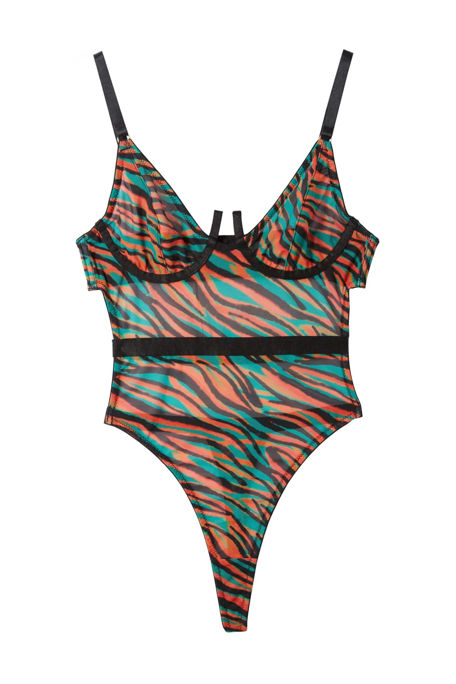 Bring out your wild side in the Binx bodysuit. Featuring blue an orange zebra printed mesh with black middle strap and high leg, what’s not to love?