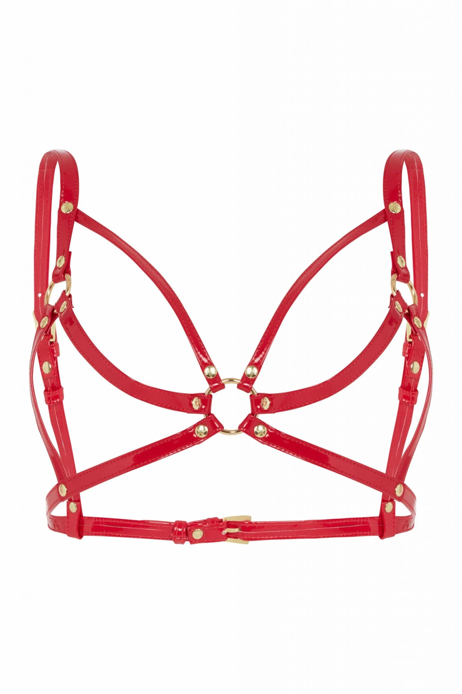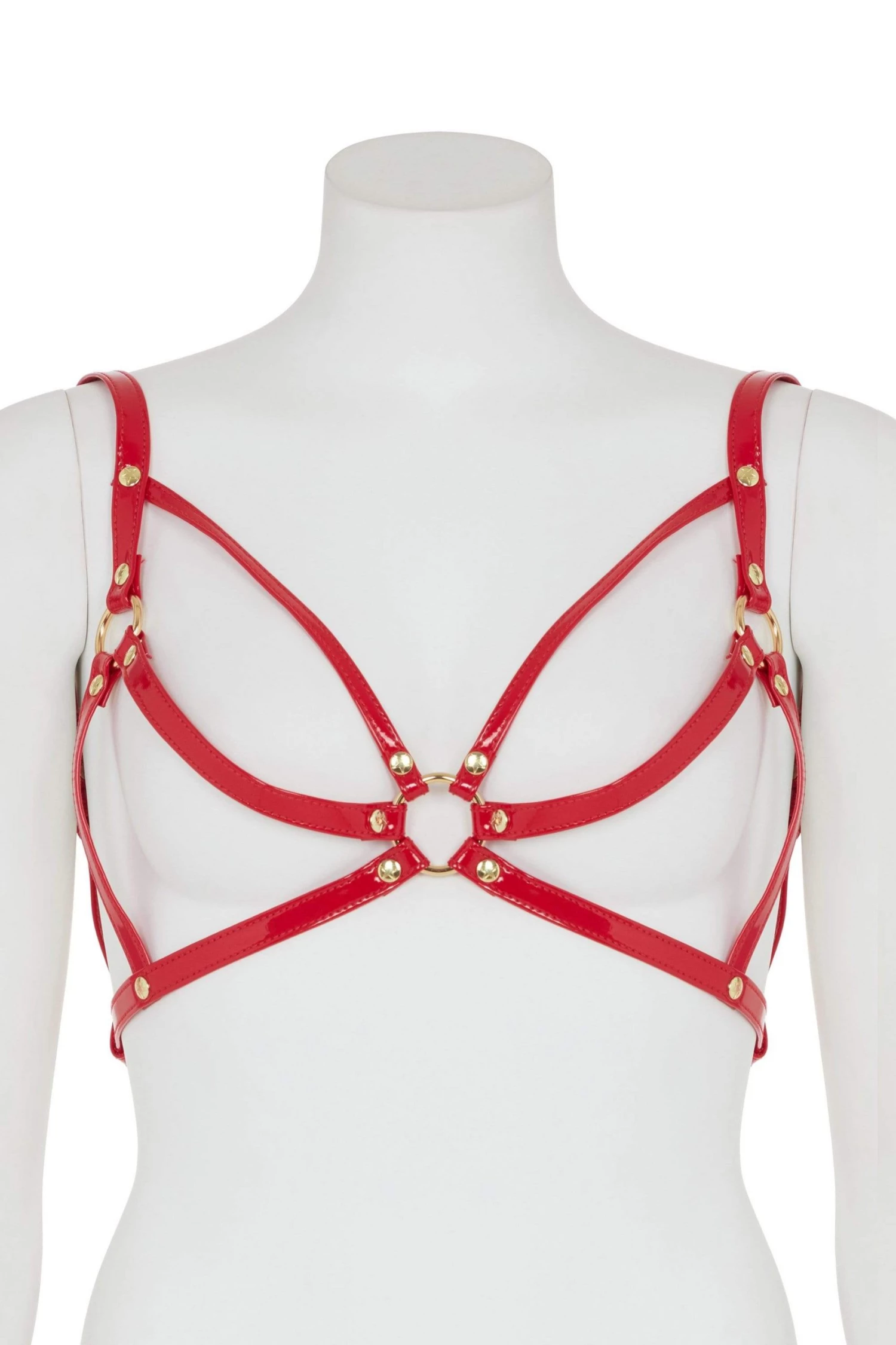 An open cup style harness bra that can be worn over anything looks stunning in this bright lipstick red.