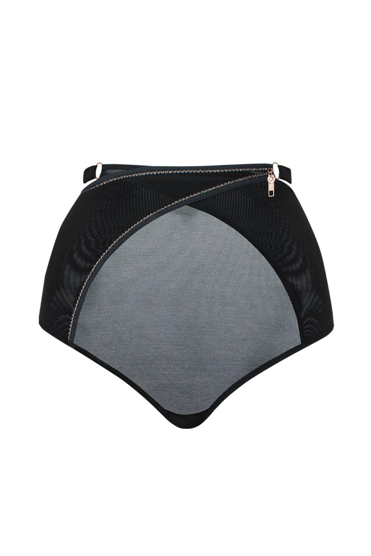 Scantilly by Curvy Kate Unzipped High Waist Brief. Where playful meet provocative- the Unzipped high waist brief is framed with zip-effect lace trimming in Scantilly’s signature rose gold. With wrap around panels and rose gold zipper end detailing. Medium leg cut with a full, flattering back. Matching bra and suspender belt available